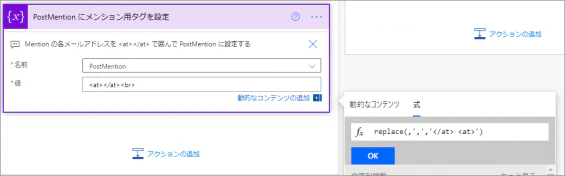 変数 Mention に値が入っていたら、各アドレスを <at>~</at> で囲み、