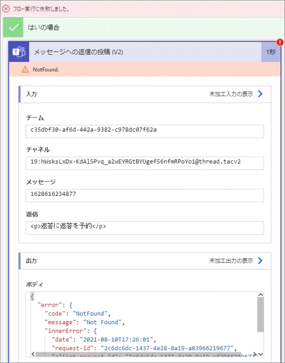 - はいの場合 の [ アクションの追加 ] -> [ 標準 ] タブ -> [ Microsoft Teams ] -> [ メッセージの返信の投稿(V2) ] を選択し