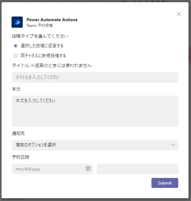 参考サイト:Microsoft Teams への予約投稿を Power Automate と Adaptive Cards でつくる