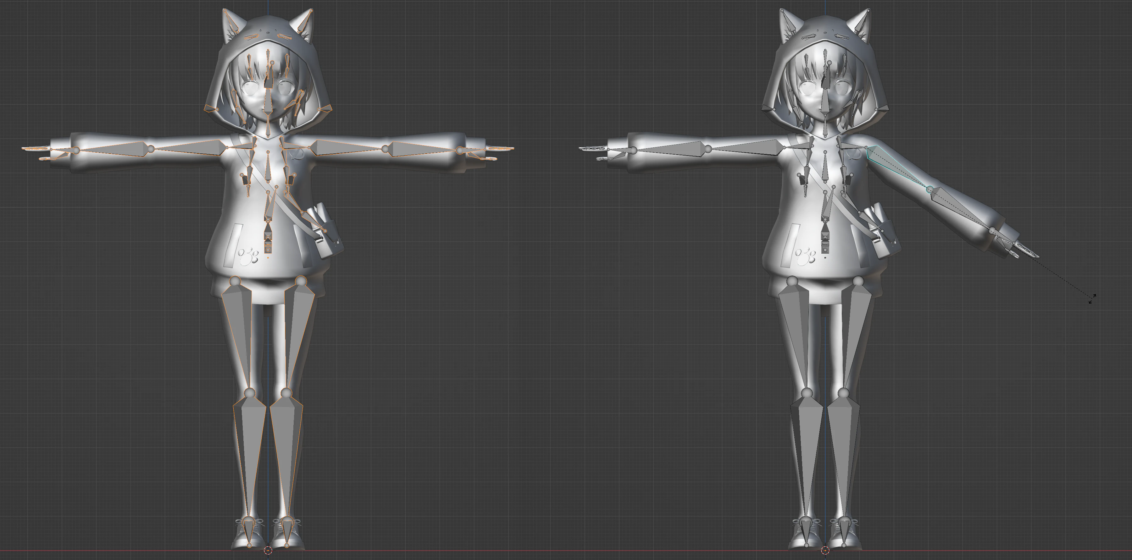 バインドポーズとは、モデルのメッシュにスケルトン(ボーン)を紐づける(バインドする)ときのポーズです。人体の場合、バインドポーズには主に腕の角度の違いによってTスタンスとAスタンスに分けられます。(画像はスケルトンがTの字をしているためTスタンスです。)