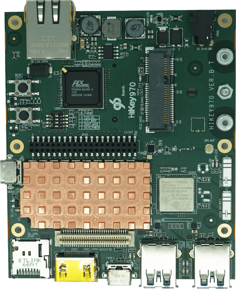 電源ケーブルと USB-C ケーブルを抜いてから、dip スイッチの 3 番を off にして、再度電源ケーブルを差せば Hikey970 が起動する。