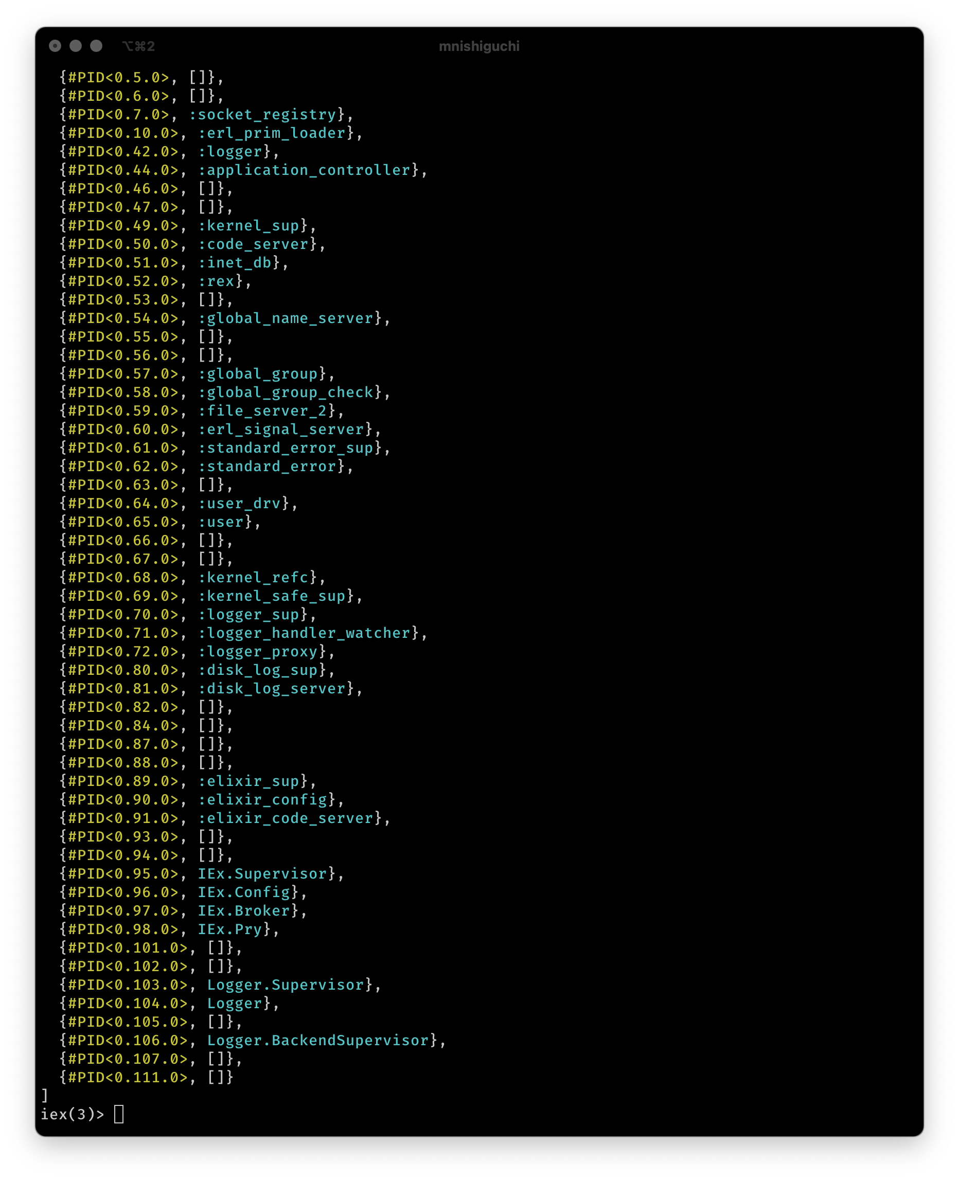 elixirで開発しているときにプロセスIDを見失ってしまうことはないでしょうか。そういうときはとりあえず全プロセスIDのリストの取得すると何か手がかりが見つかるかもしれません。