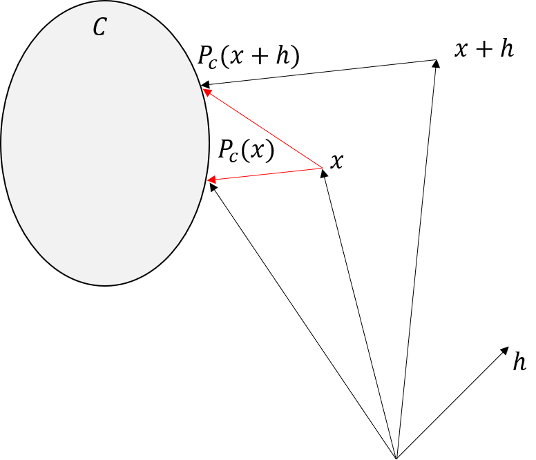 $||x-P_C(x)||$は$||x-P_C(x)||$が最小となるように点$P_C(x)$が定まり点$x$との距離が決まる。一方で、$||x-P_C(x+h)||$は$||x+h-P_C(x+h)||$が最小となるように点$P_C(x+h)$が定まり点$x$との距離が決まる。そのため、$||x-P_C(x+h)||$は$||x-P_C(x)||$よりも点$x$との距離が大きくなることがわかる。