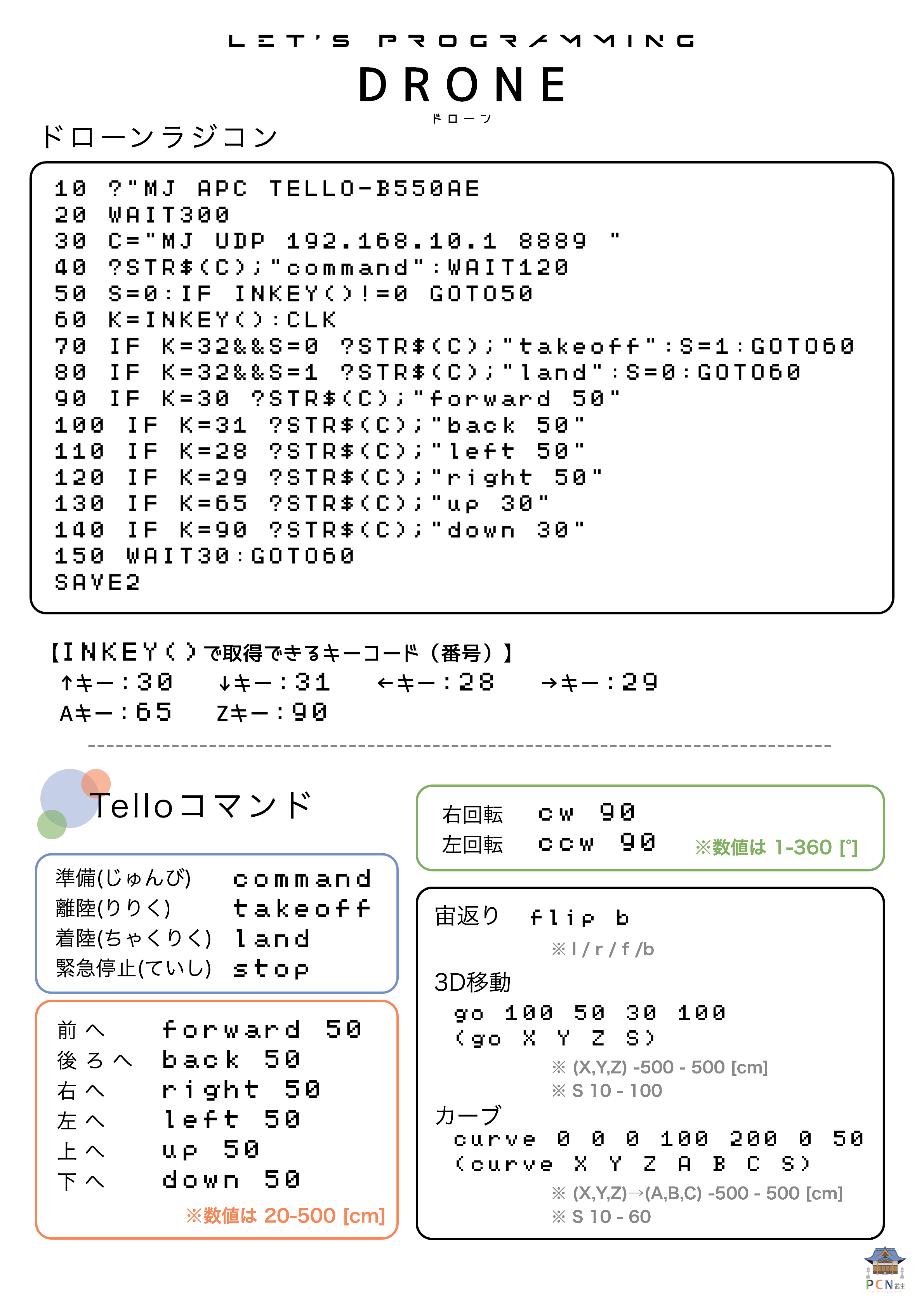 こどもたちは、テンションが上がってくると、ついついキーを連打してしまうのでドローンに命令がいき過ぎないアイデアです。