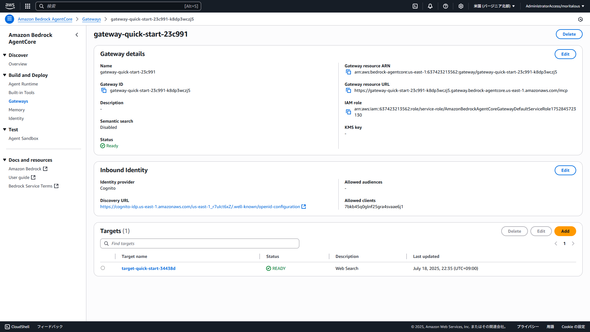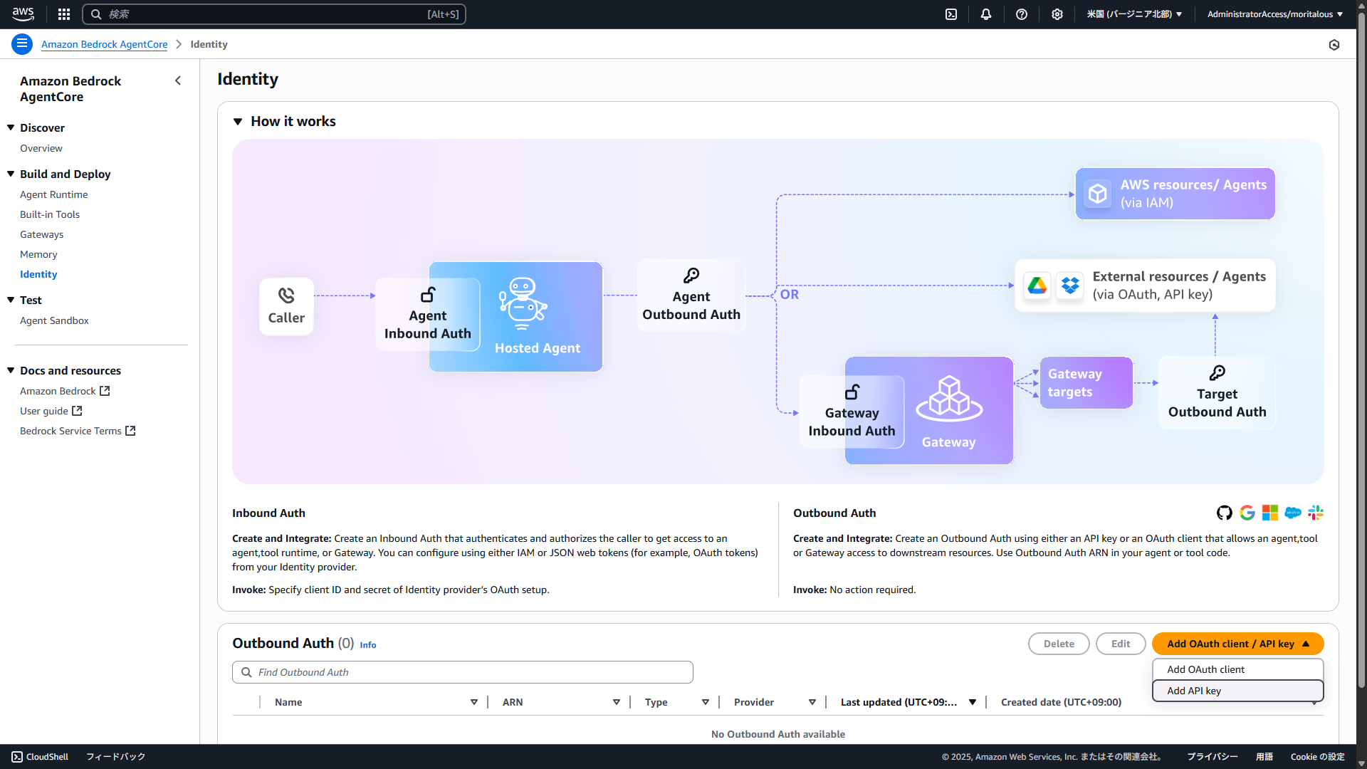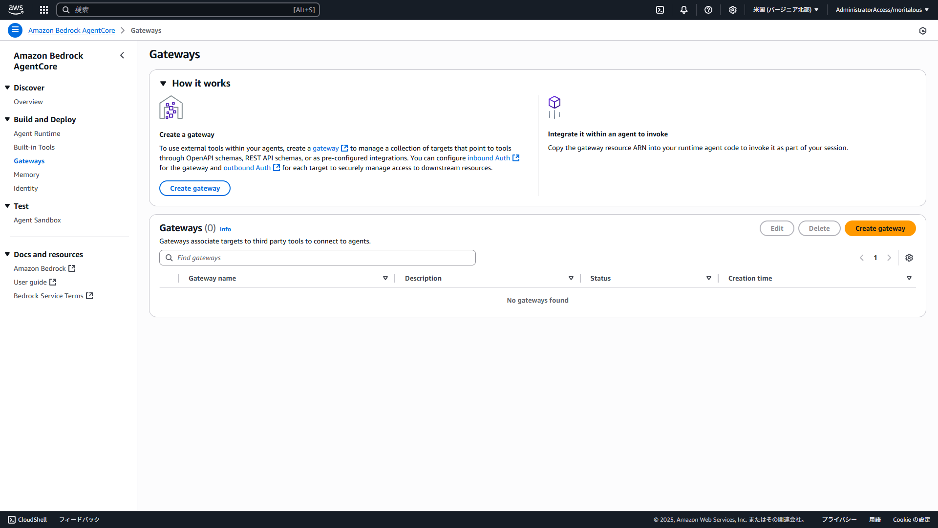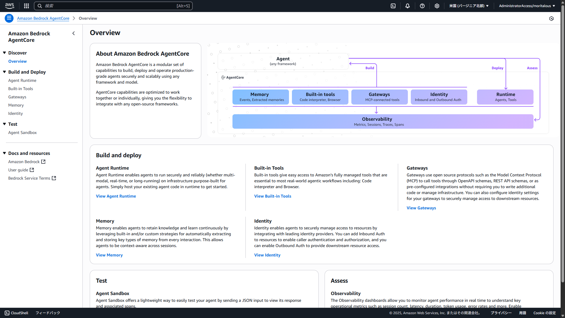 Amazon Bedrock AgentCoreの管理画面を開きます。