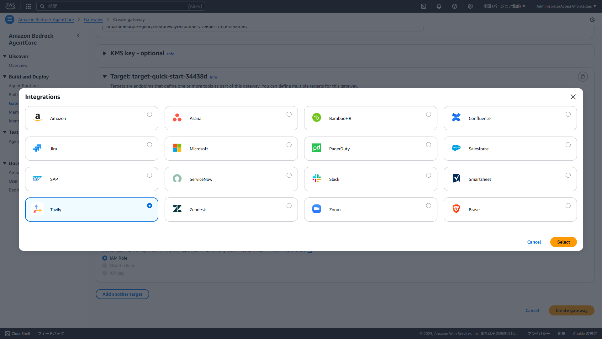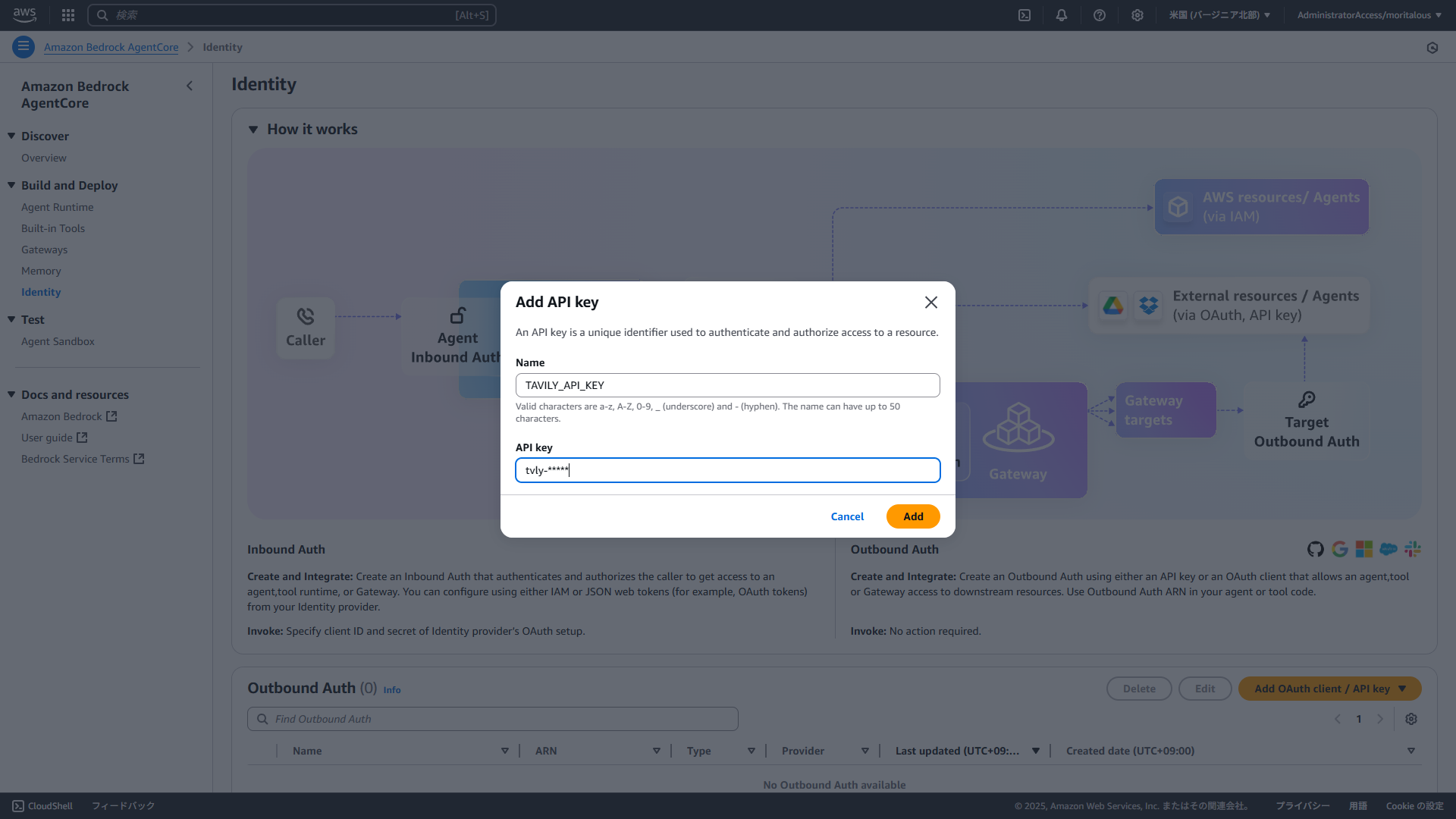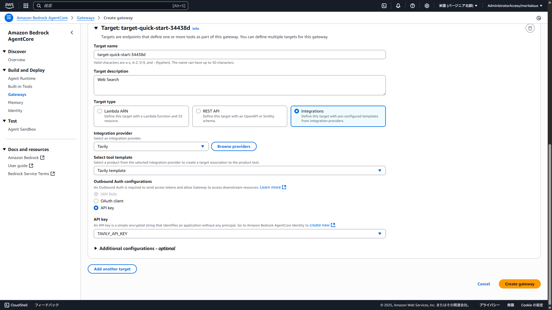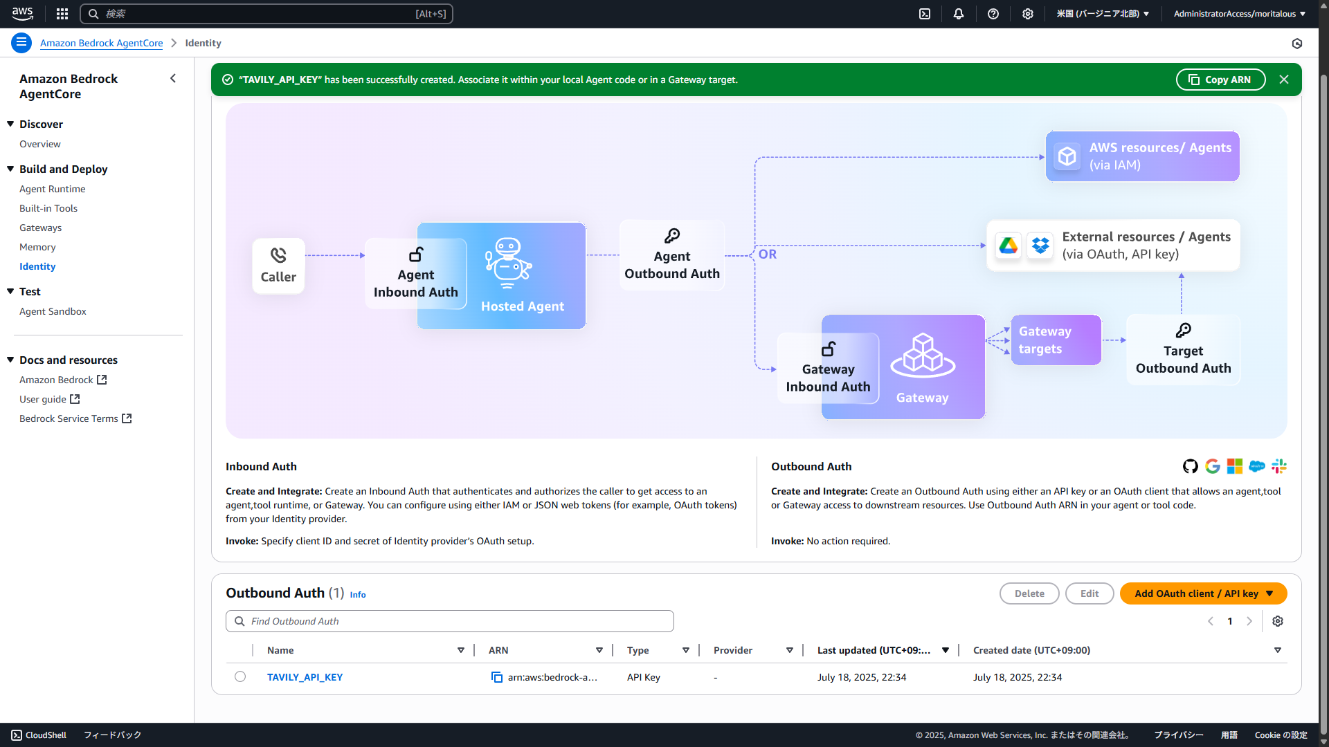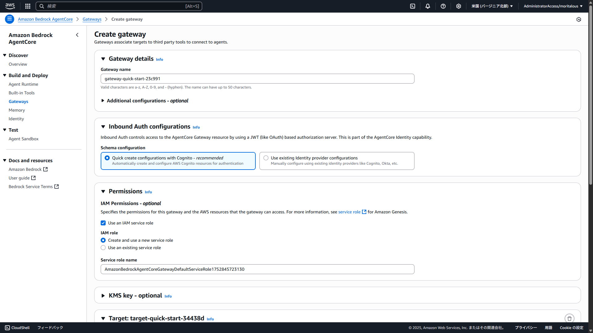 Amazon Bedrock AgentCoreの管理画面を開きます。