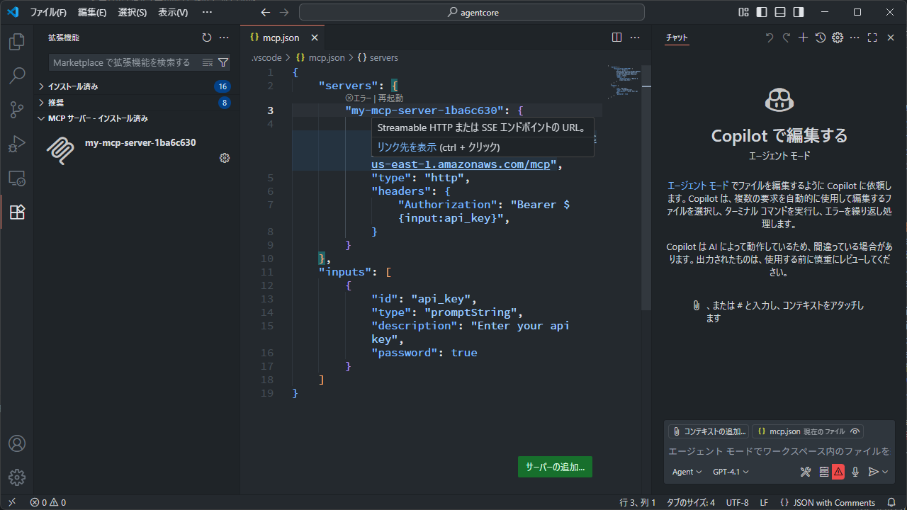 MCPの設定ファイルが作成されますが、設定が不足しているので接続に失敗します。