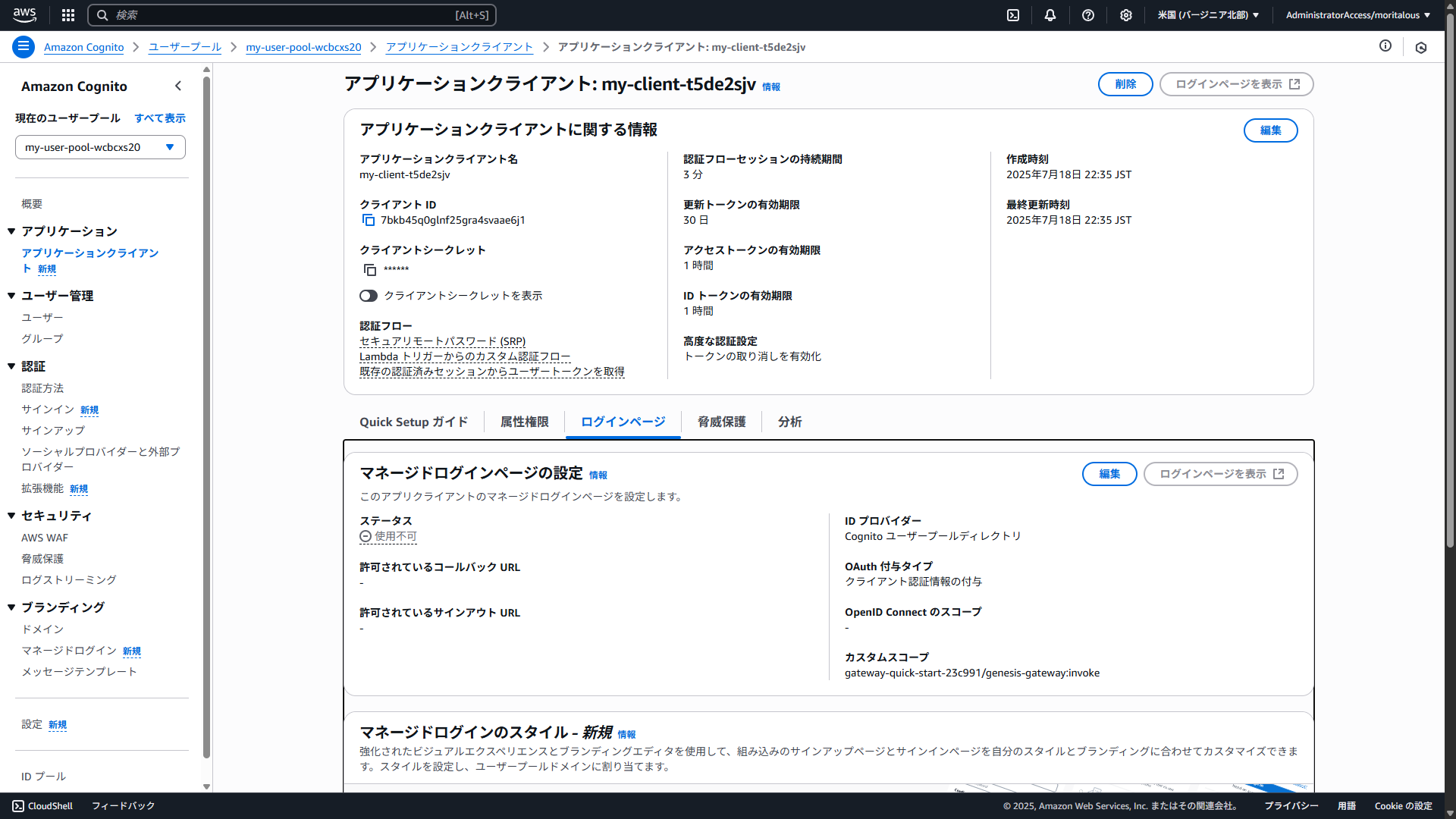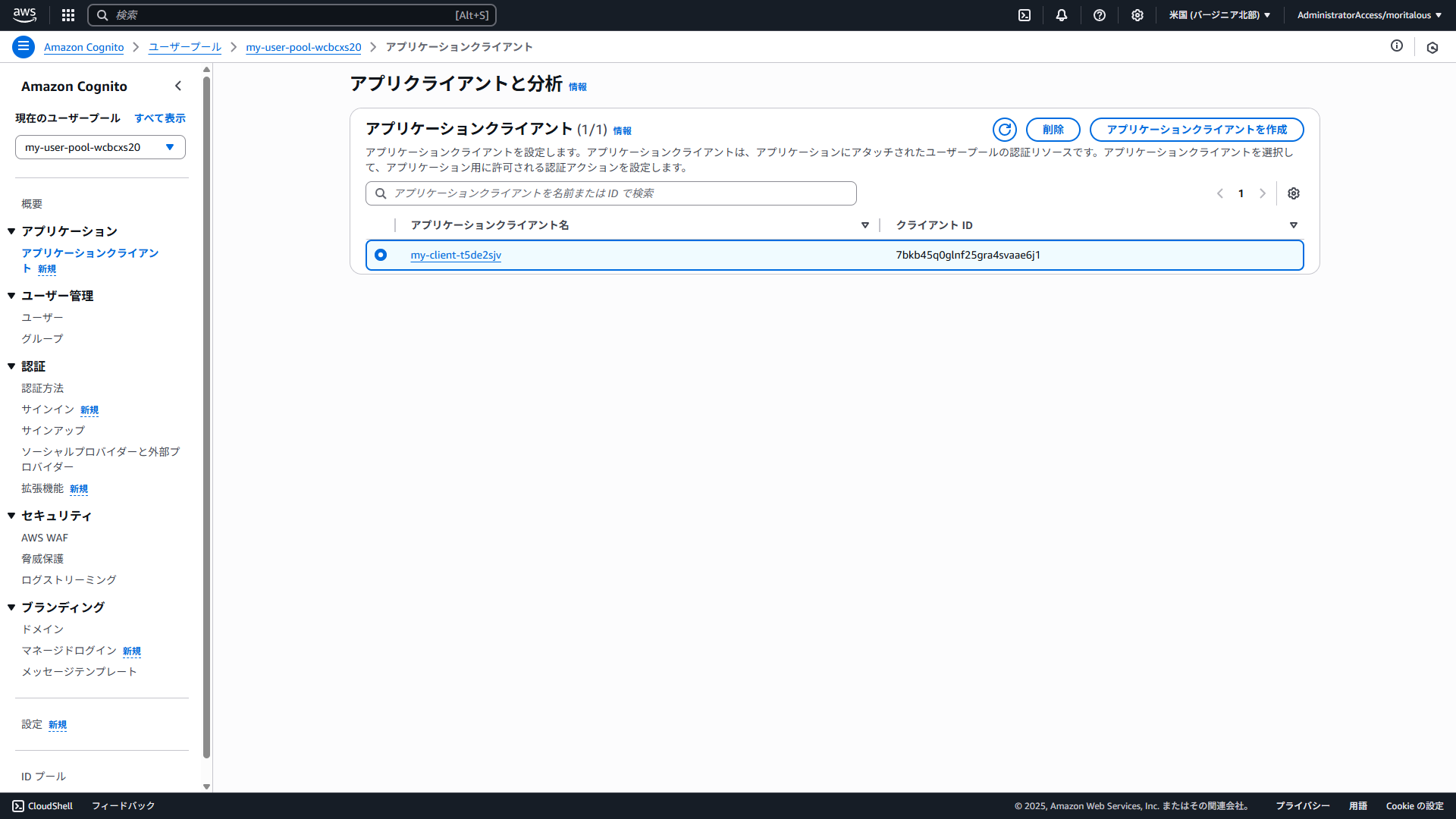 Cognitoの管理画面を開き、該当の(作成日時が一番最近のやつ)を選択します。