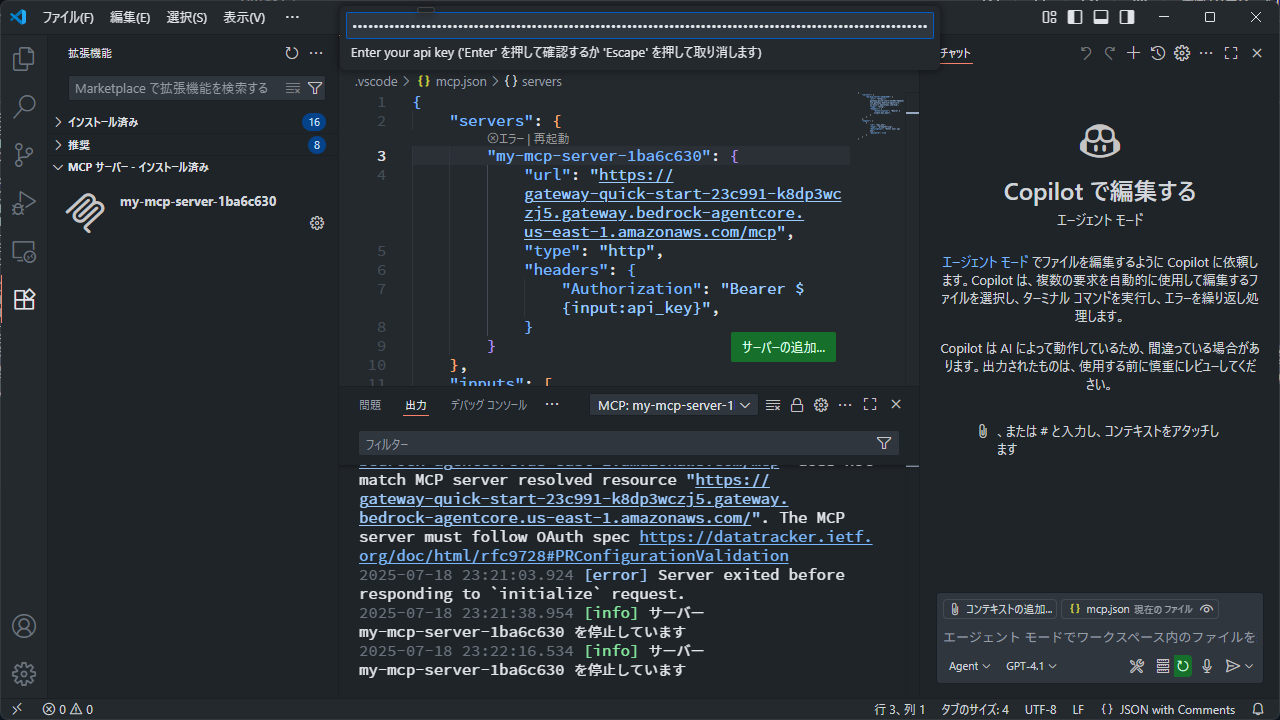 こんな感じでHTTPヘッダーにAuthorizationヘッダーを送信するように設定します。{ "servers": { "my-mcp-server-1ba6c630": { "url": "*****", "type": "http", "headers": { "Authorization": "Bearer ${input:api_key}", } } }, "inputs": [ { "id": "api_key", "type": "promptString", "description": "Enter your api key", "password": true } ] } -
