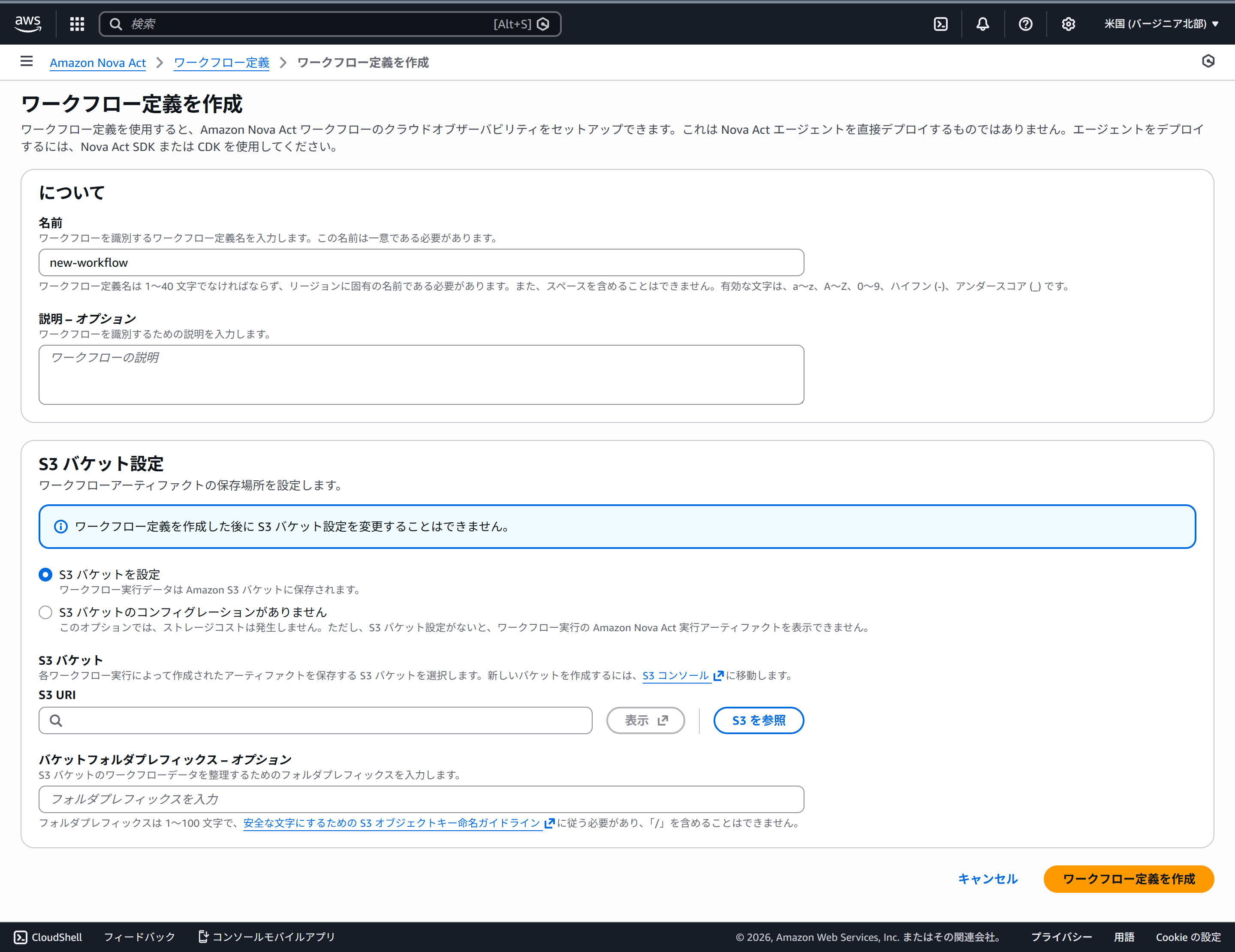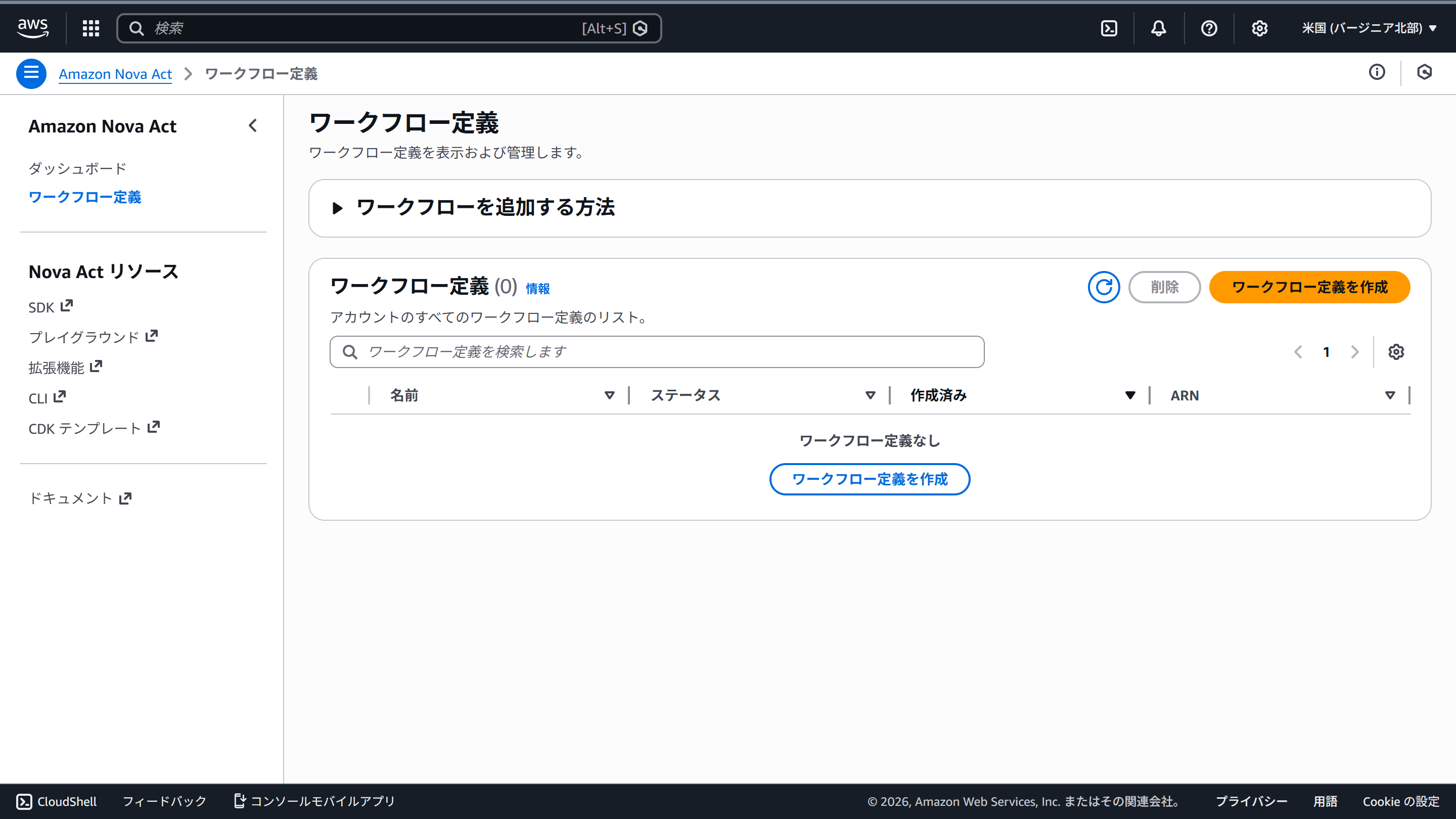 本日時点で、Nova Actはバージニア北部でのみ利用可能です。マネコンでワークフローを作ります。