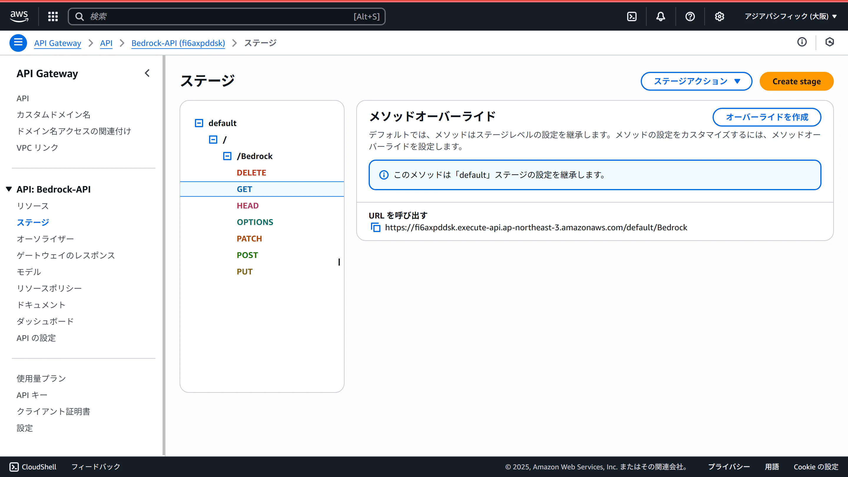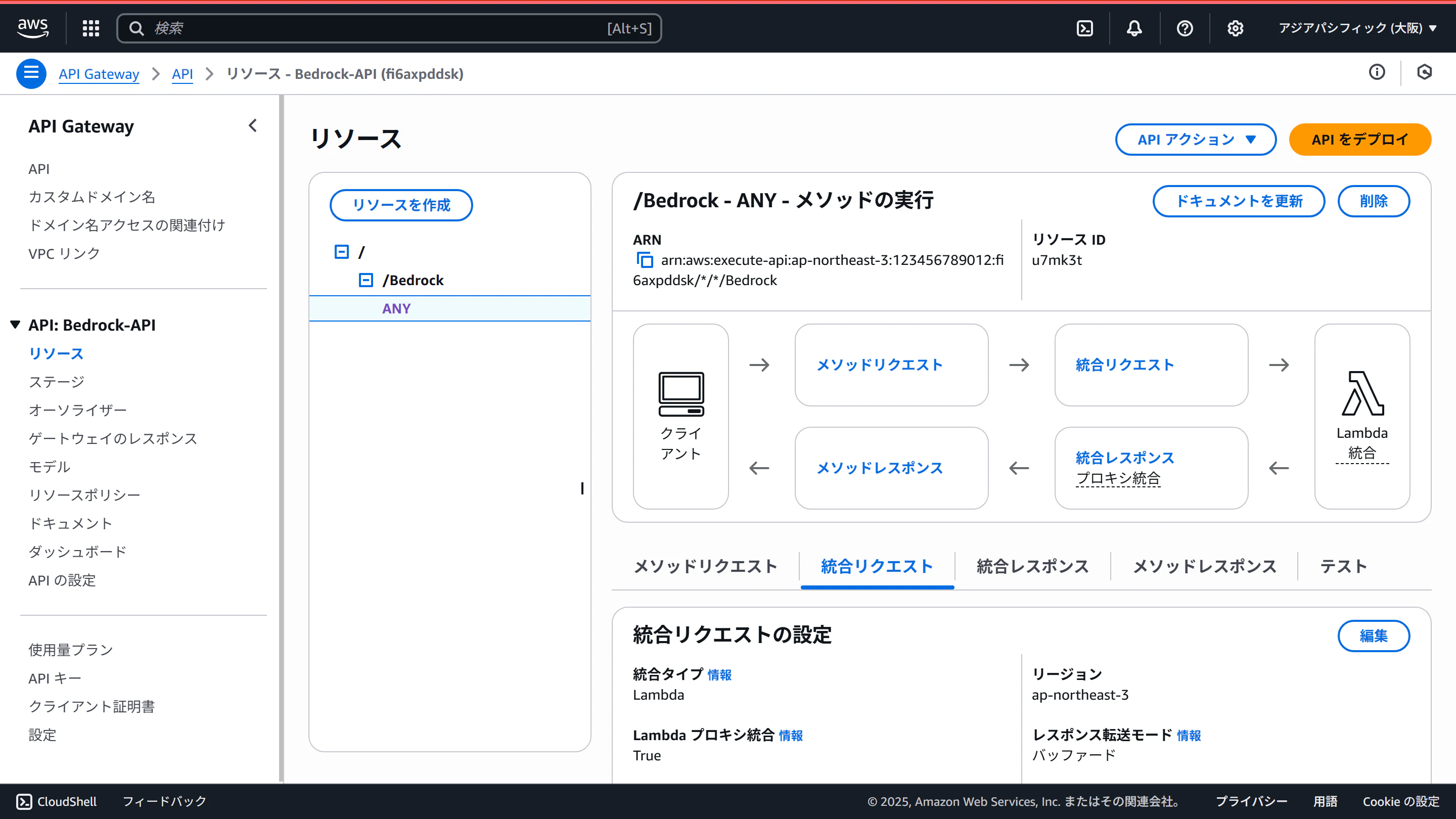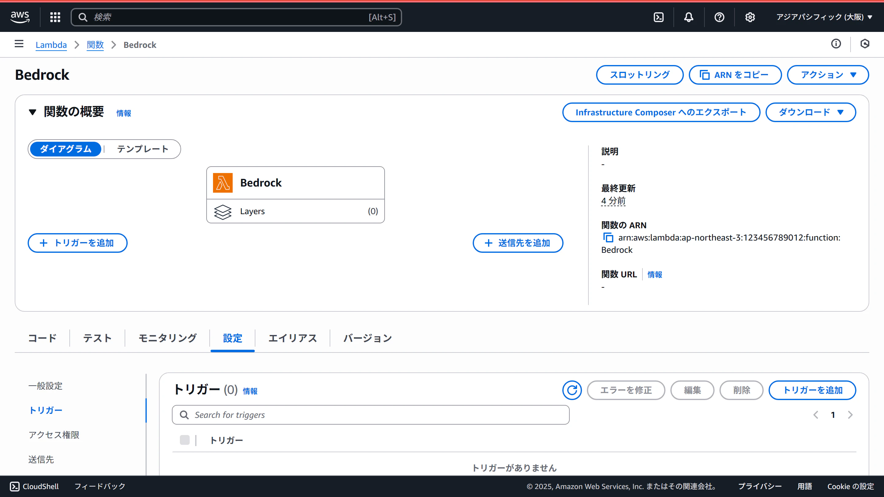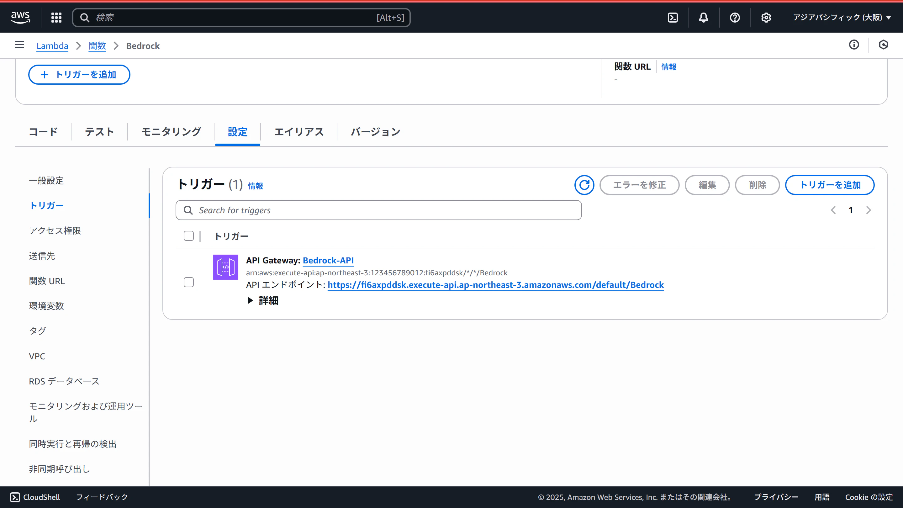 設定タブのトリガーを開き、API名(Bedrock-API)をクリックします