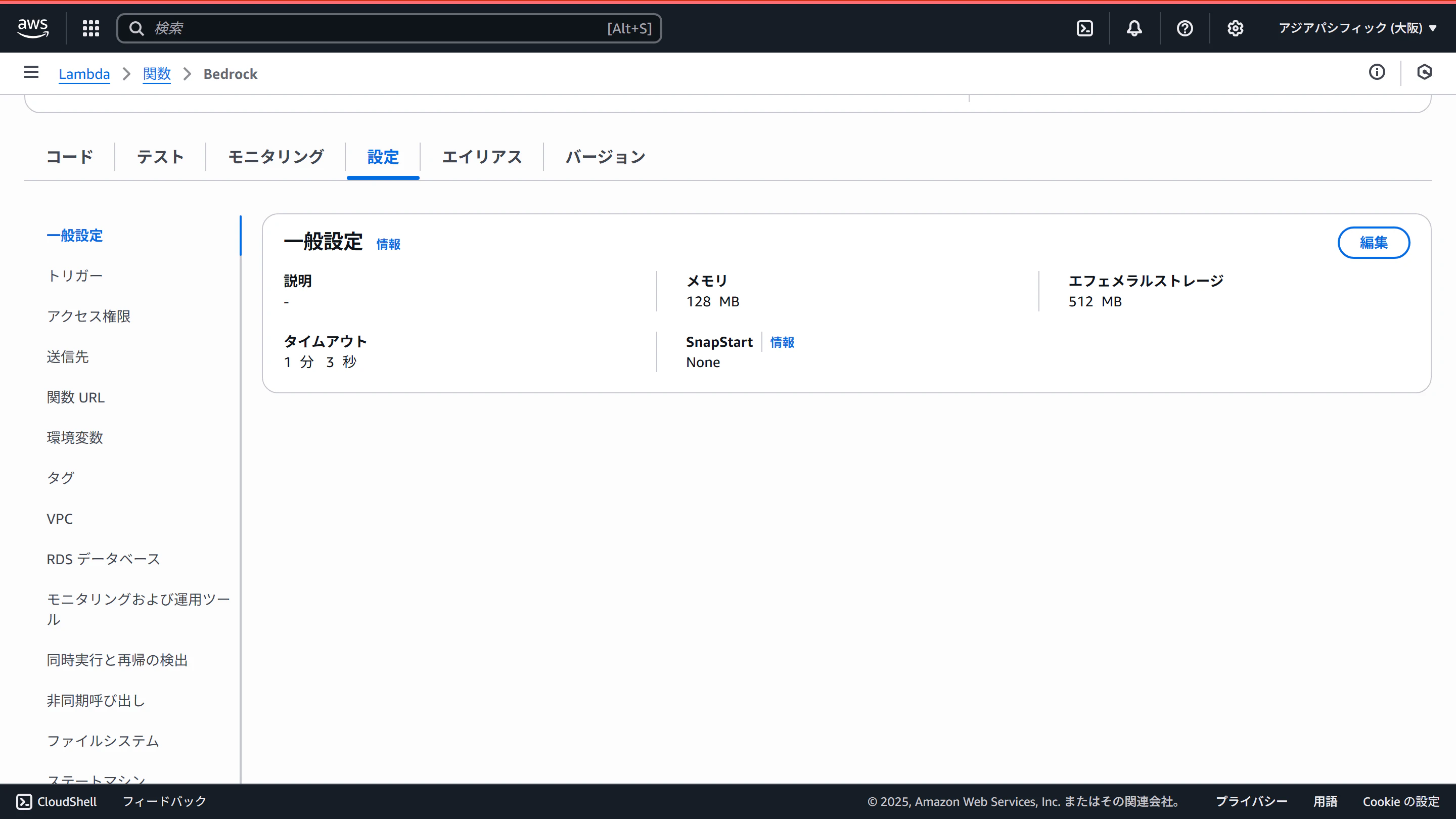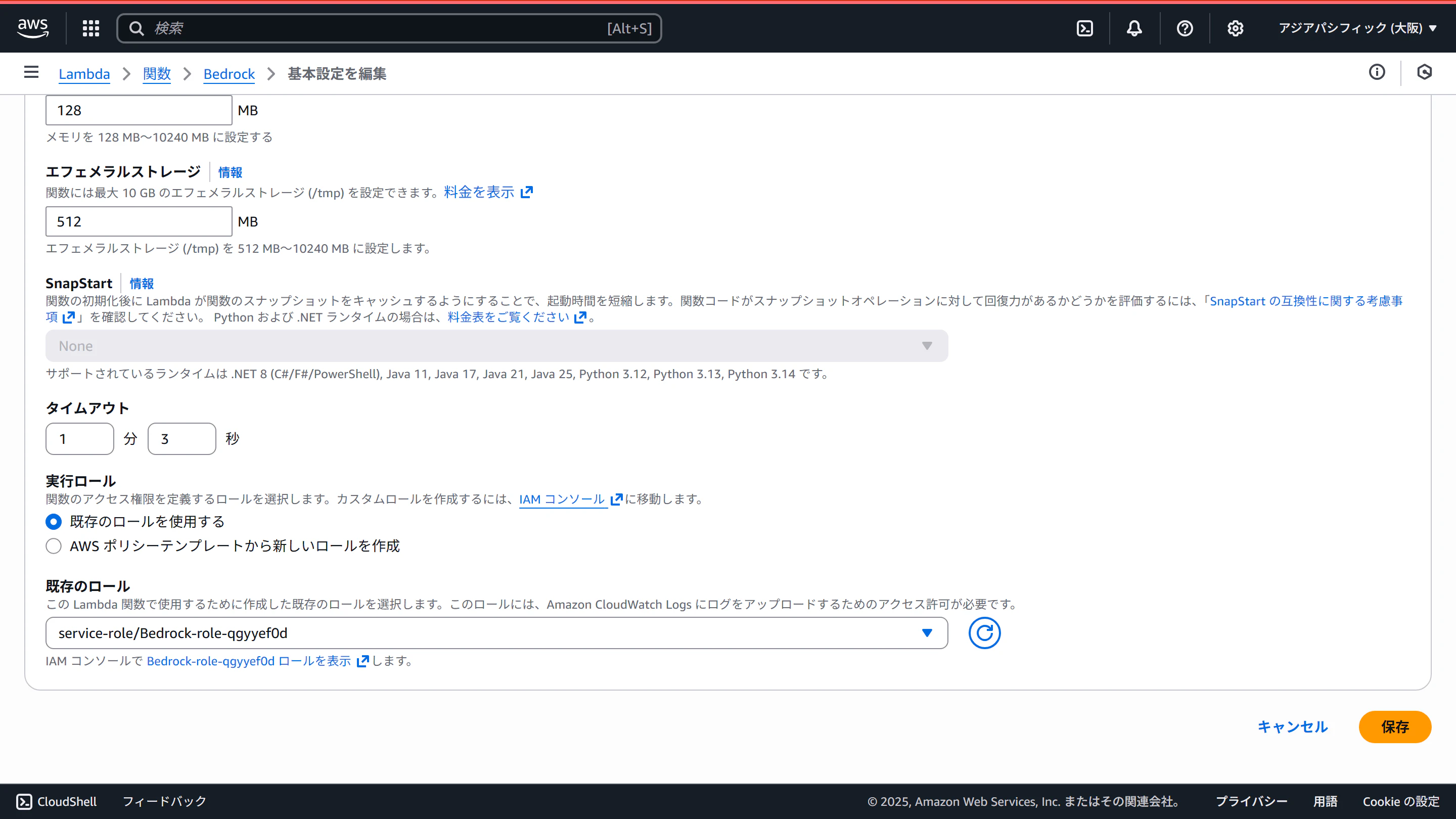 設定タブの一般設定で、タイムアウト値を伸ばして、IAMロールにBedrockへのアクセス権限(とりあえずAmazonBedrockFullAccess)を付与します