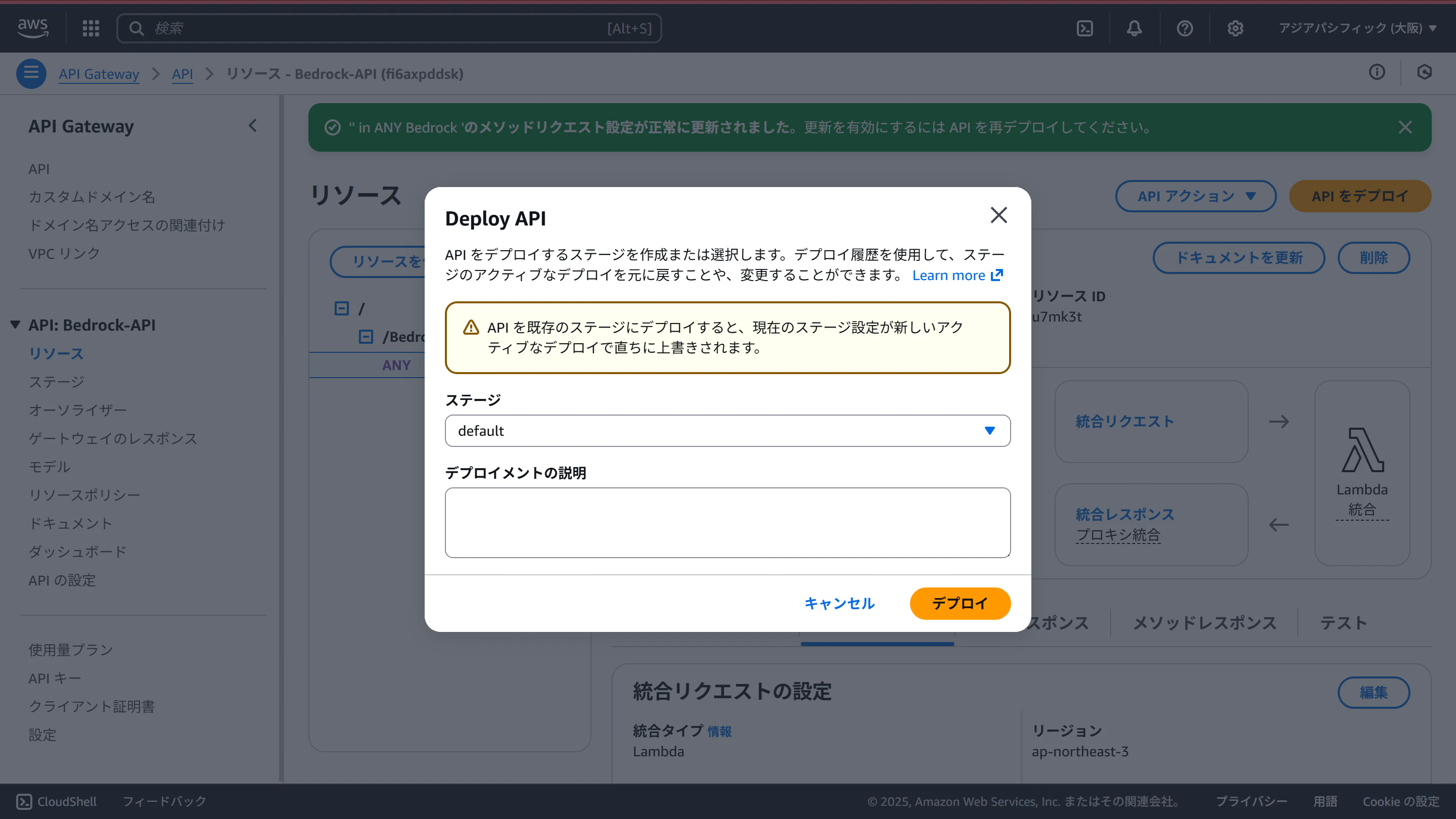 「APIをデプロイ」ボタンをクリックし、デプロイします