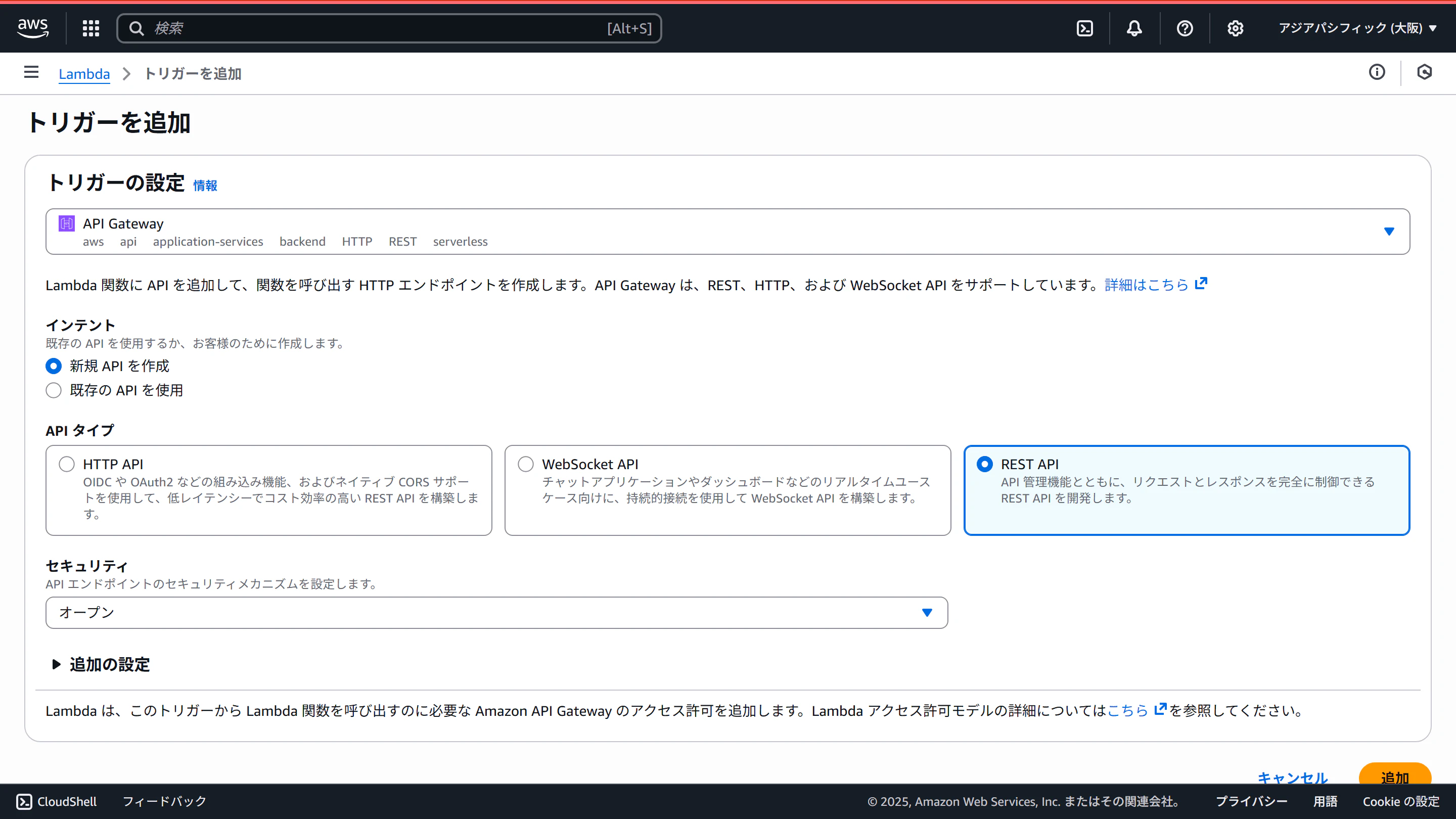API Gatewayを選び、「REST API」を選びます。(HTTP APIは多分ストリームに未対応です)