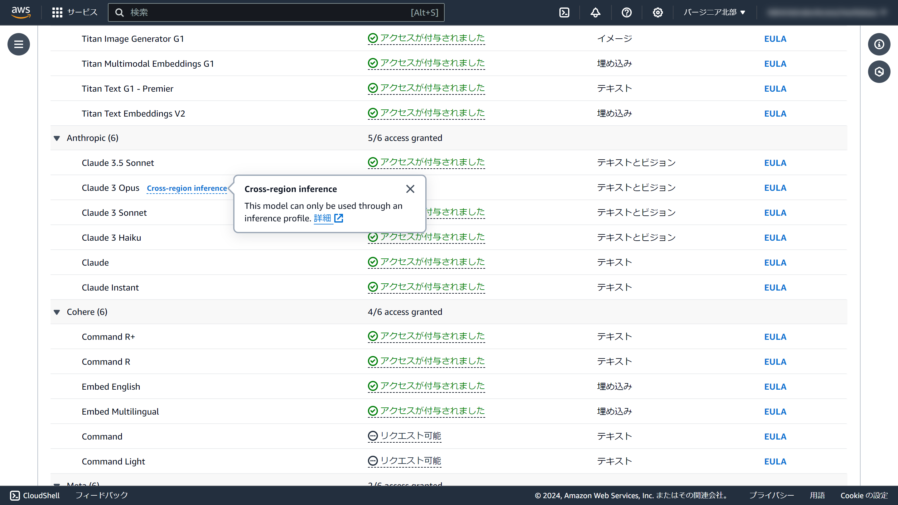 Opusが提供されているリージョンはオレゴンのみでしたが、モデル一覧を見ると、クロスリージョン推論用途でのみ、バージニア北部リージョンが使える雰囲気です。