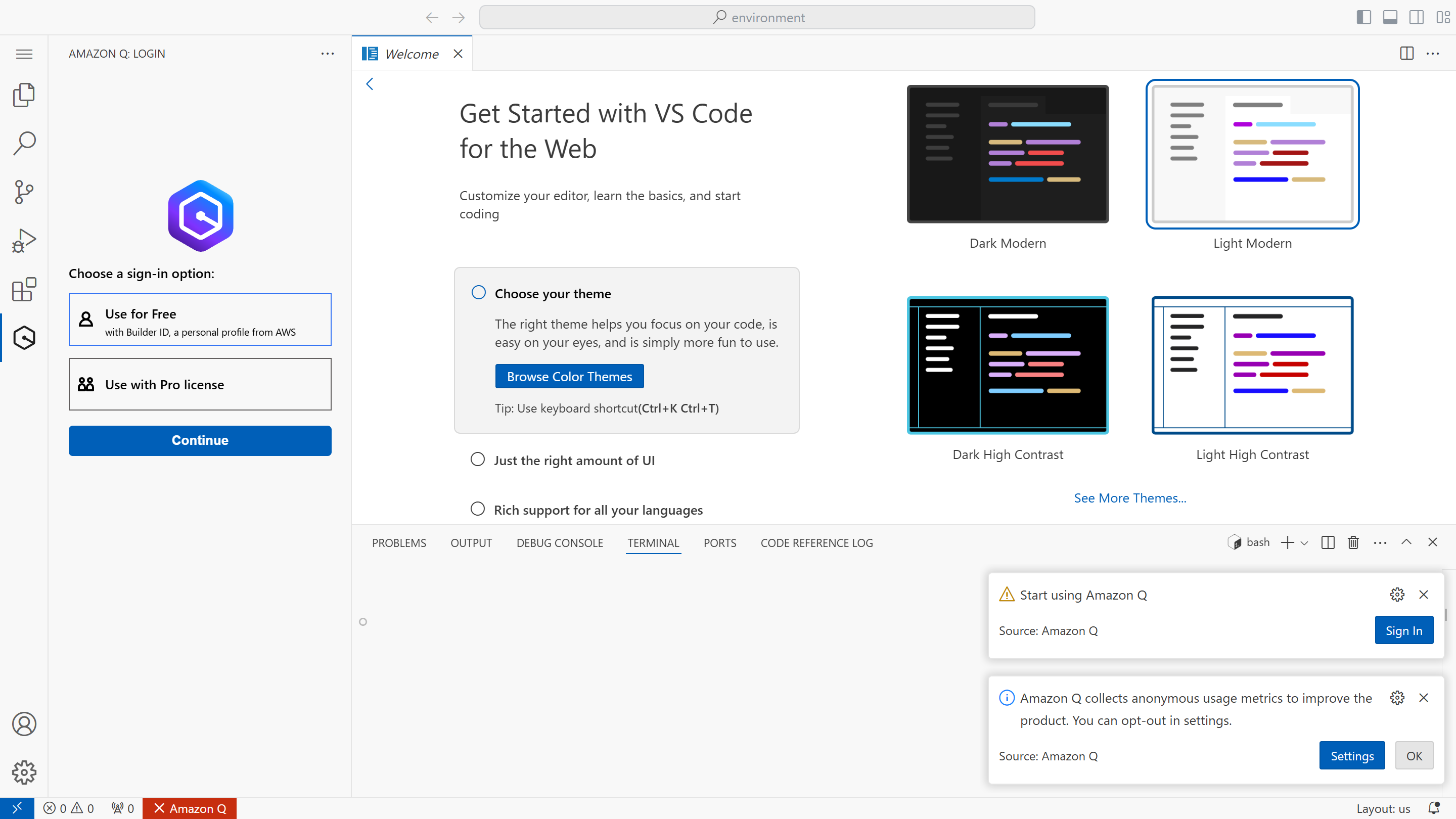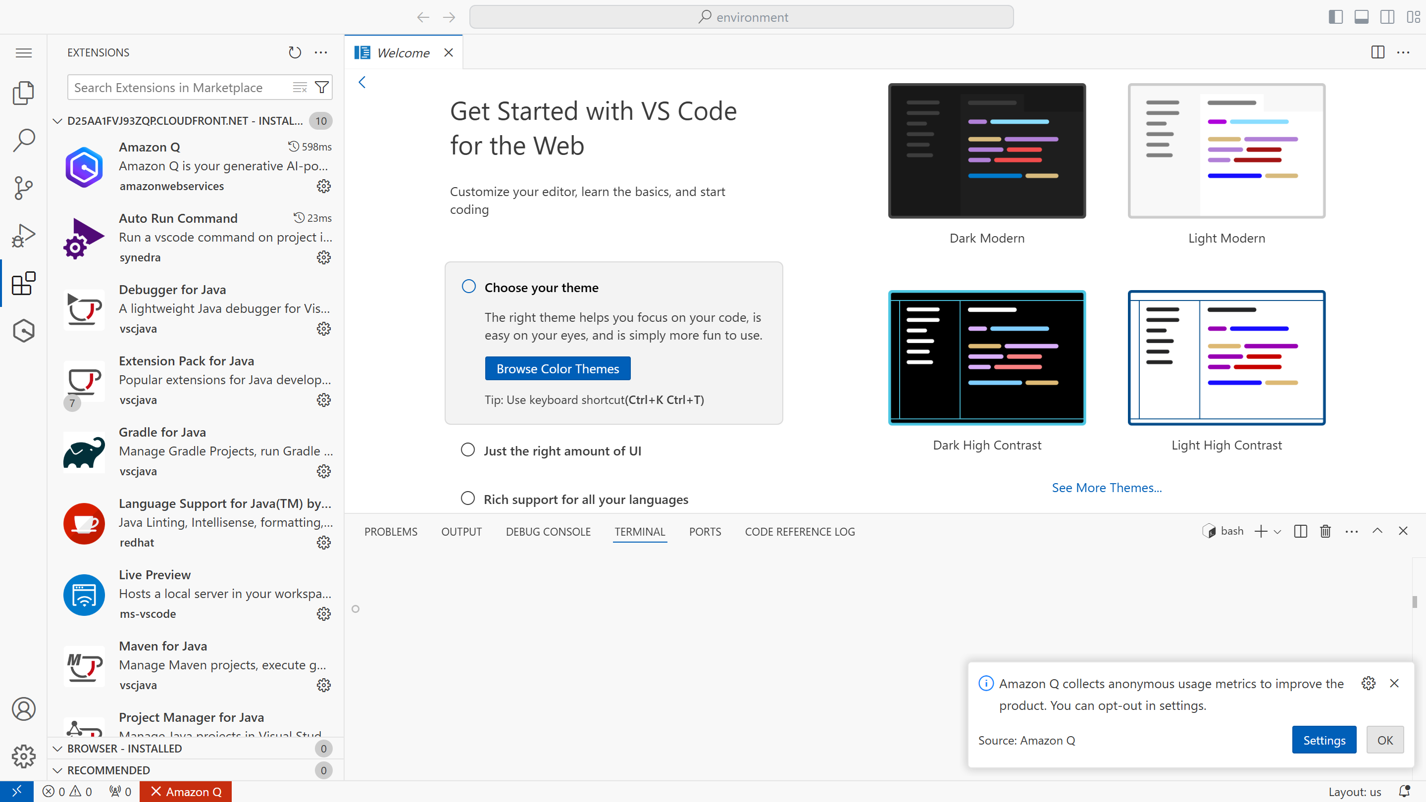 Amazon Q Developerをはじめ、開発に必要そうな拡張機能もインストール済みです。