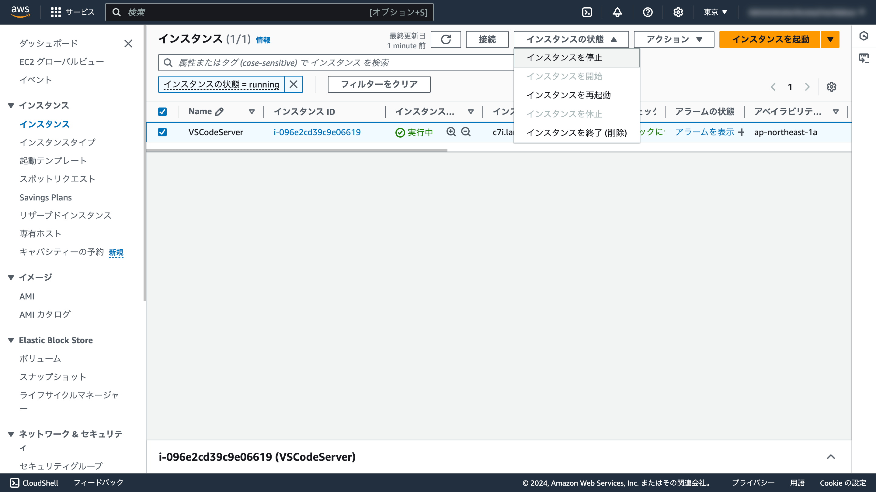 EC2を停止したい場合は、EC2の管理画面にアクセスします。「VSCodeServer」という名前のインスタンスを選択し、「インスタンスの状態」メニューの「インスタンスを停止」をクリックします。