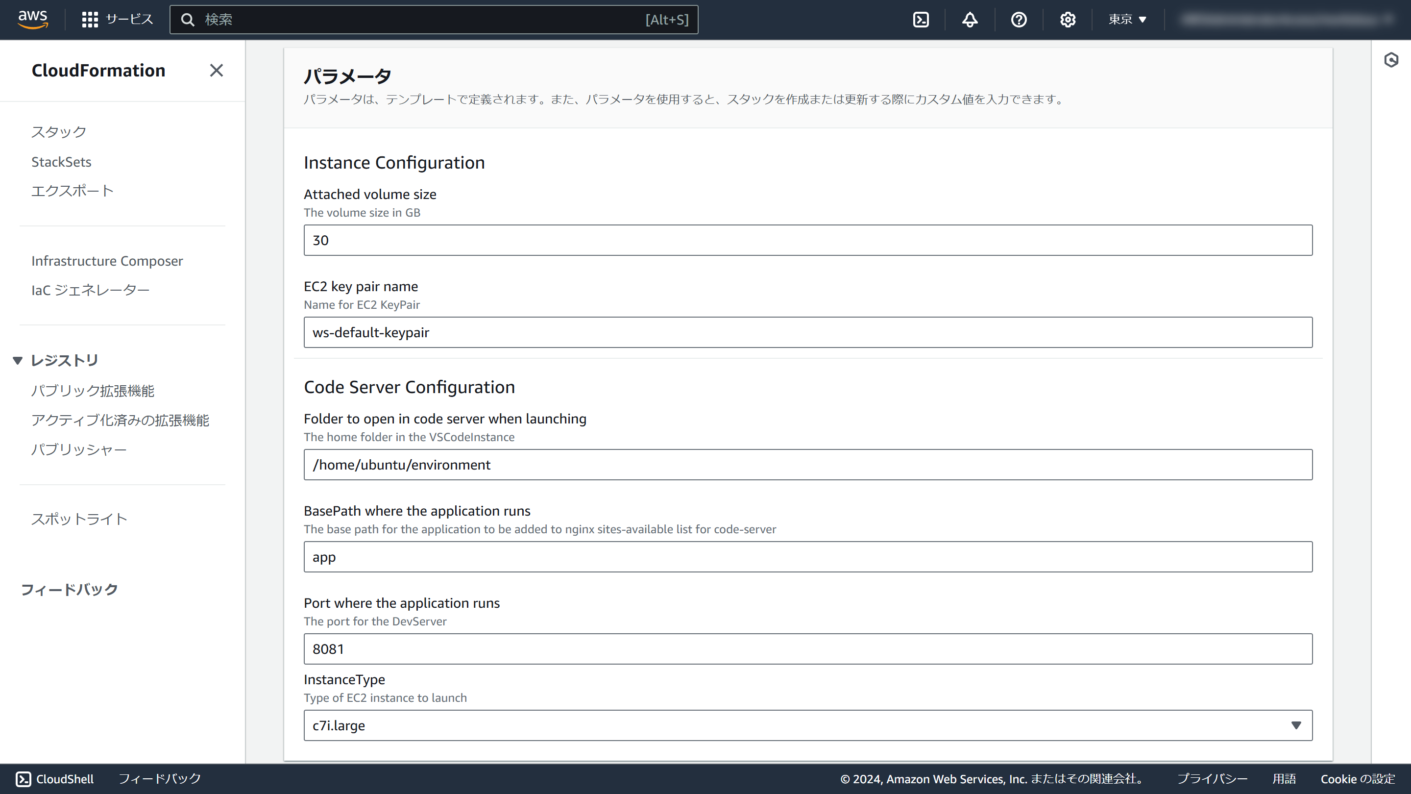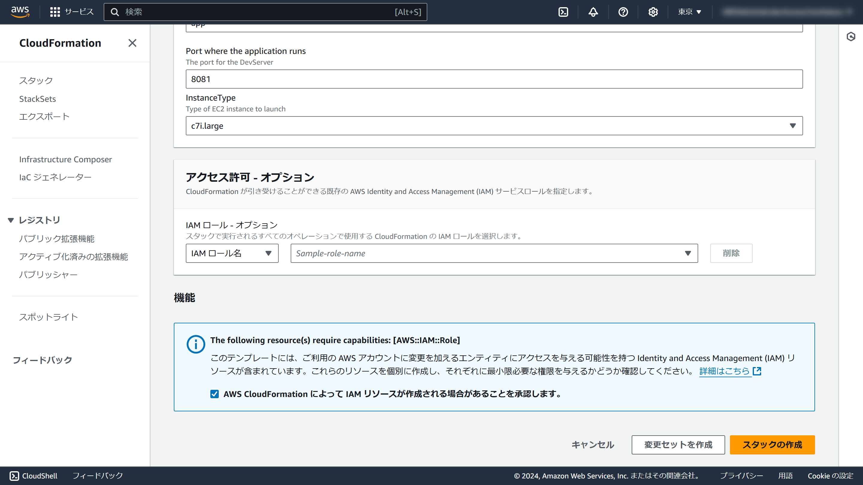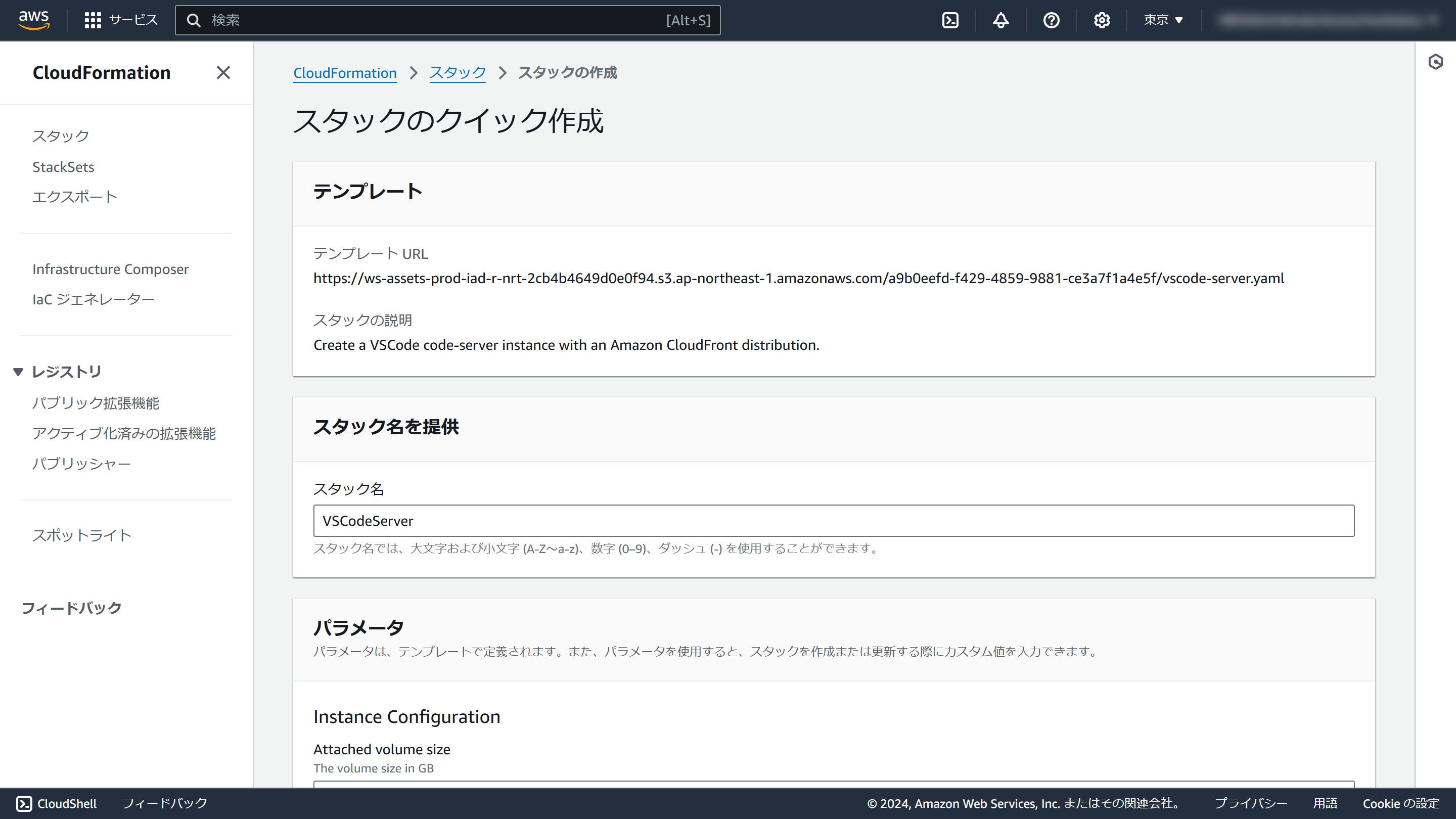 スタックのクイック作成画面が表示されます。必要でしたらパラメータなどを修正してください