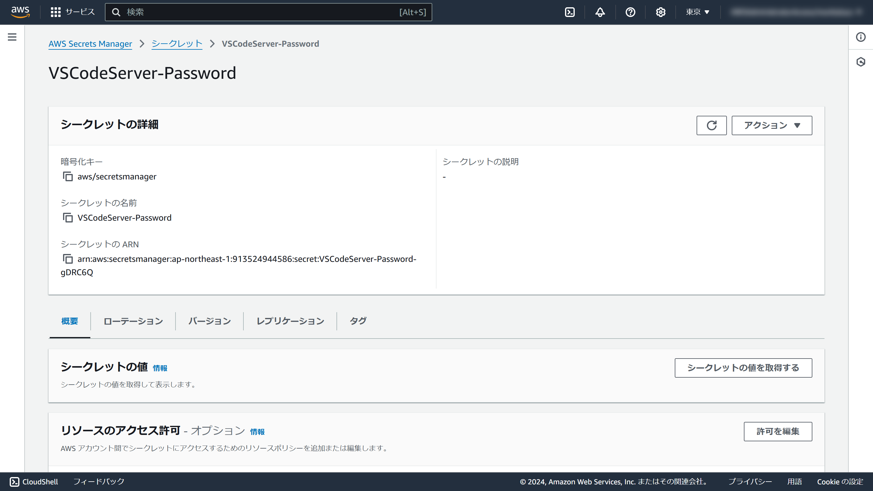 Secrets Managerの画面に遷移します。「シークレットの値を取得する」ボタンをクリックすると、パスワードが表示されるのでメモしてください