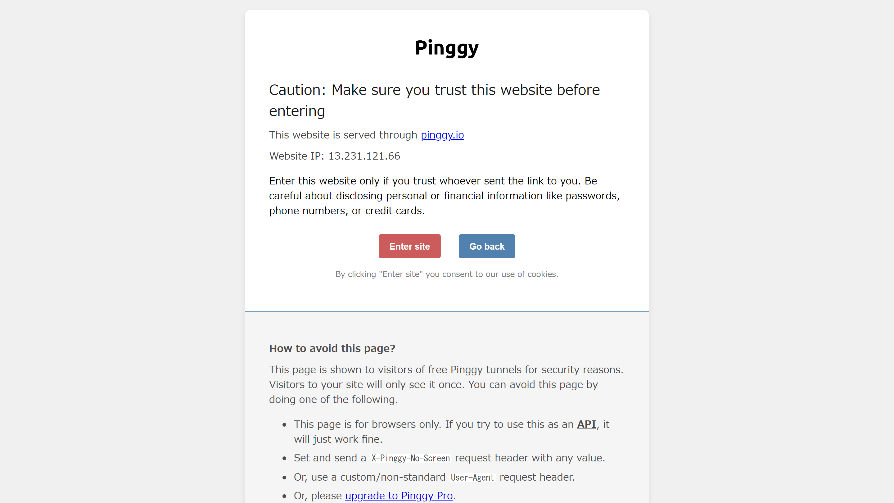 The authenticity of host '[a.pinggy.io]:443 ([139.162.8.164]:443)' can't be established. RSA key fingerprint is SHA256:nFd5rfJMGuZXvfeRzJ/BtT3TfksAxTWMajcrHRcI7AM. This key is not known by any other names Are you sure you want to continue connecting (yes/no/[fingerprint])?以下のように、URLが表示されます
