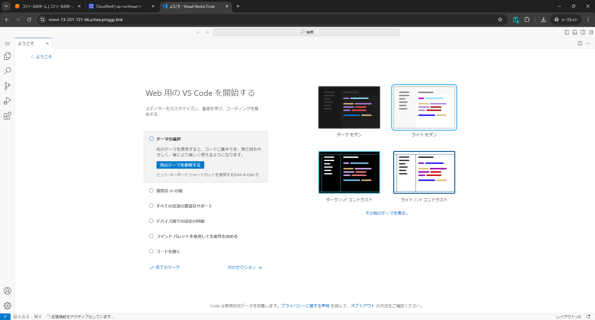 code serve-web --without-connection-token --accept-server-license-terms* * Visual Studio Code Server * * By using the software, you agree to * the Visual Studio Code Server License Terms (https://aka.ms/vscode-server-license) and * the Microsoft Privacy Statement (https://privacy.microsoft.com/en-US/privacystatement). * Web UI available at http://127.0.0.1:80008000番ポートで起動していることが確認できます