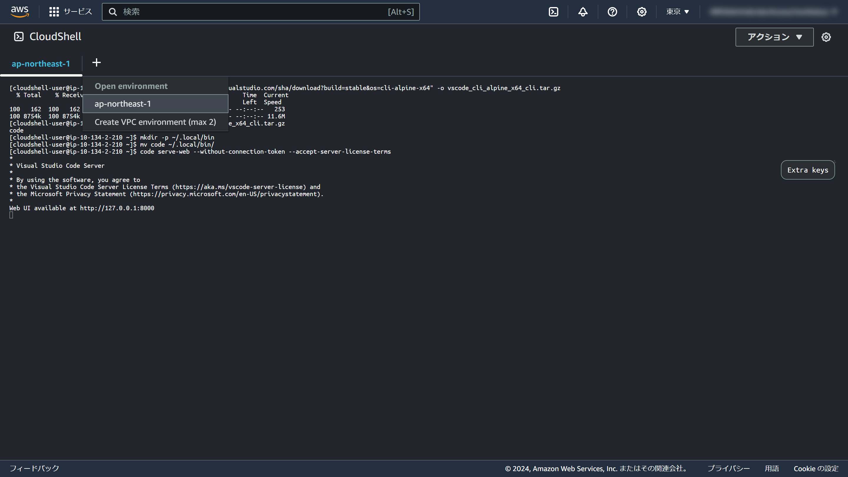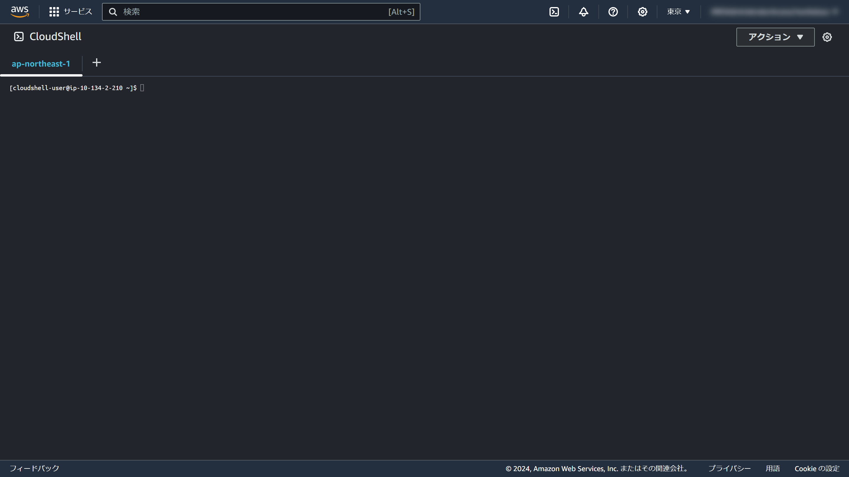 AWS CloudShell( https://ap-northeast-1.console.aws.amazon.com/cloudshell/home )にアクセスします