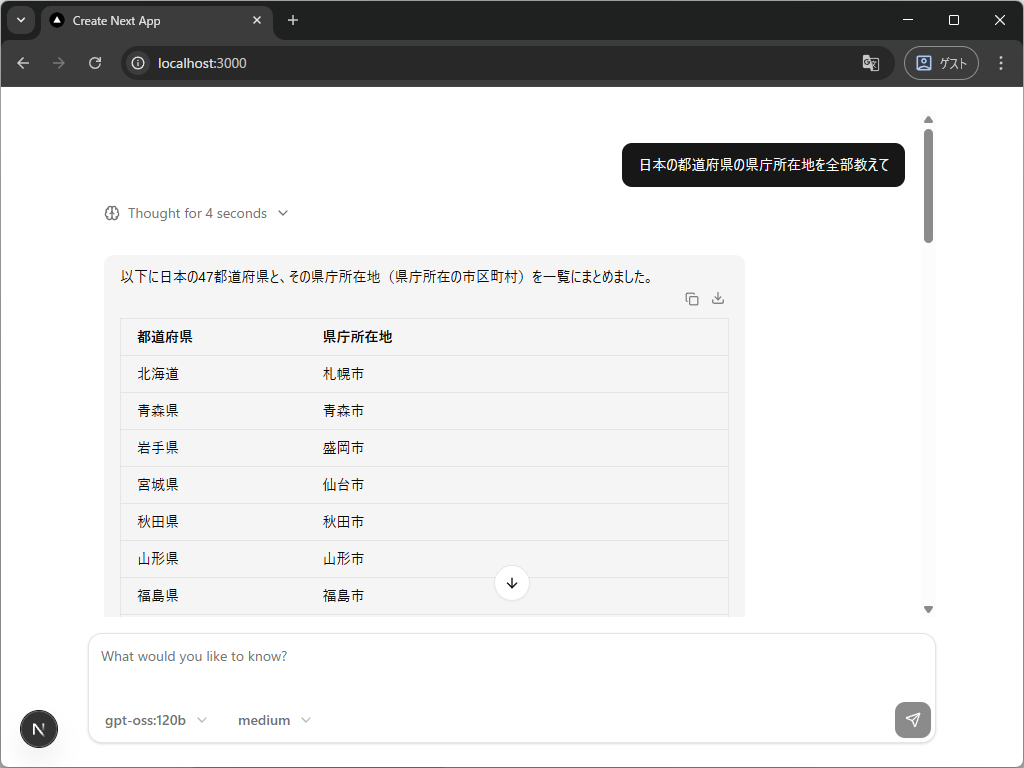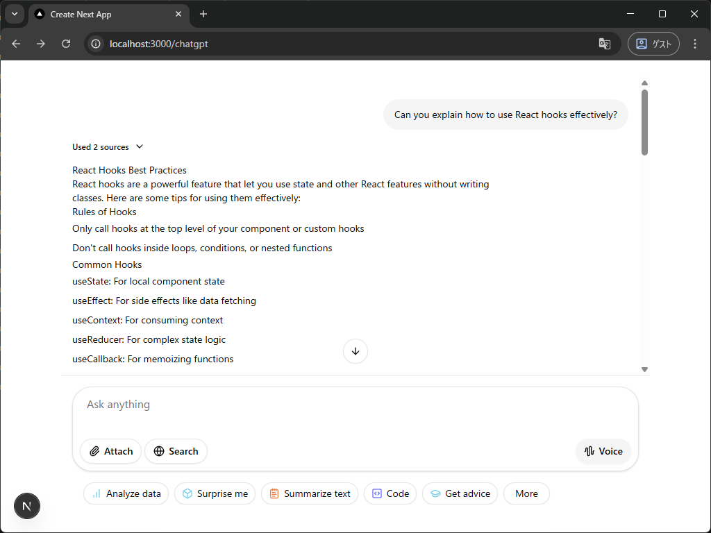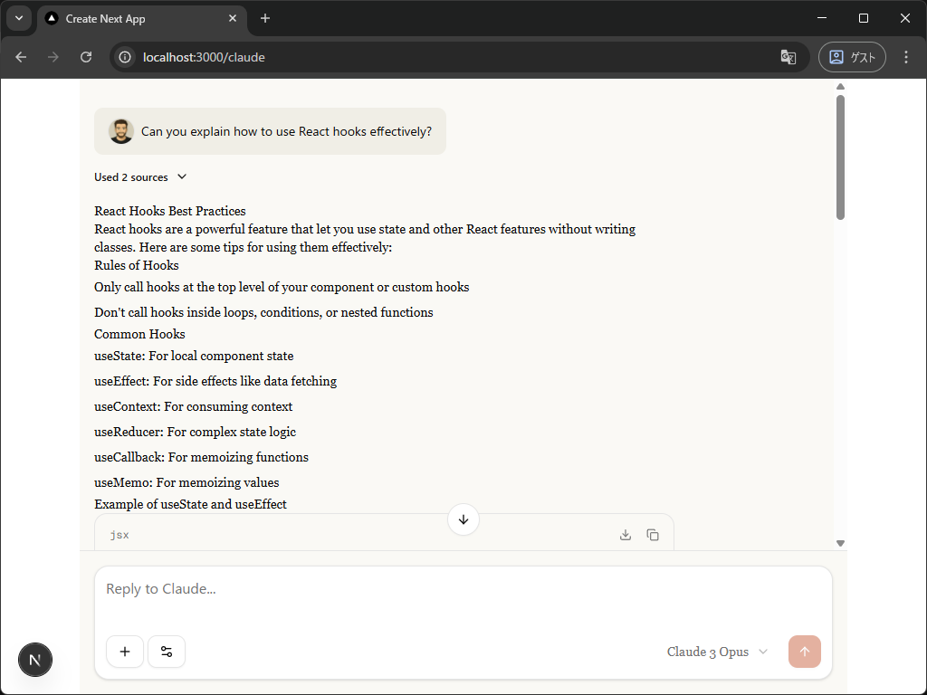 もちろんストリーミングにも対応してますし、RAGの情報源や思考過程を表示するコンポーネントも用意されているので、超便利です。