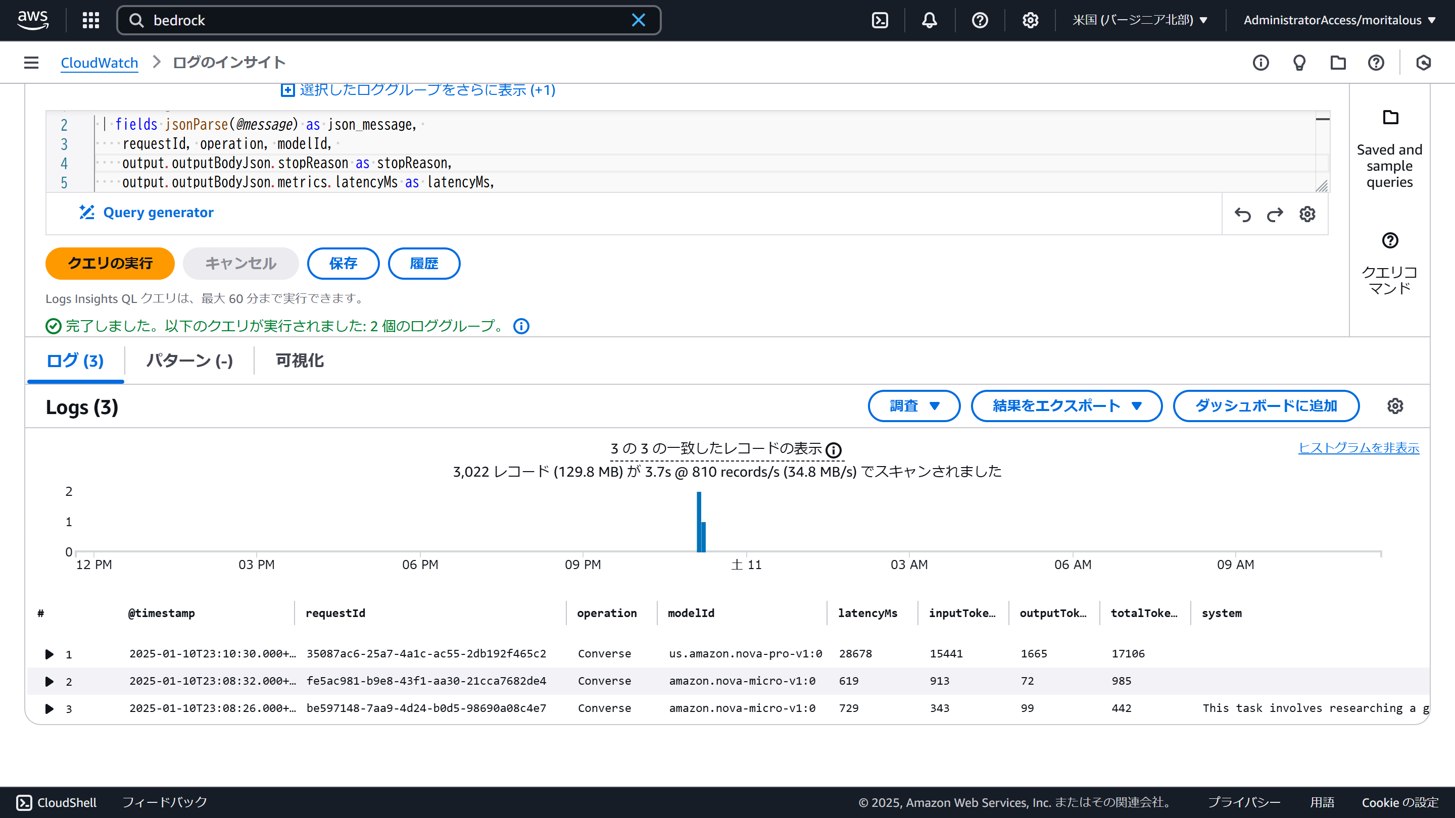 ConverseかConverseStreamのものだけを表示するfilter @logStream = 'aws/bedrock/modelinvocations' | fields @timestamp, requestId, operation, modelId, @message | filter operation in ["Converse", "ConverseStream"] -
