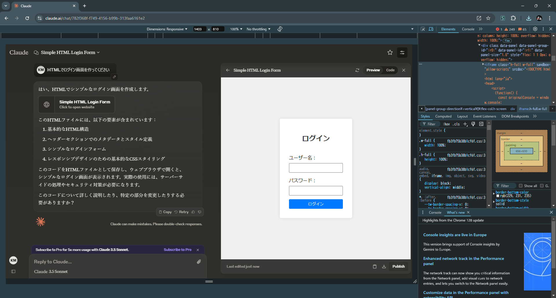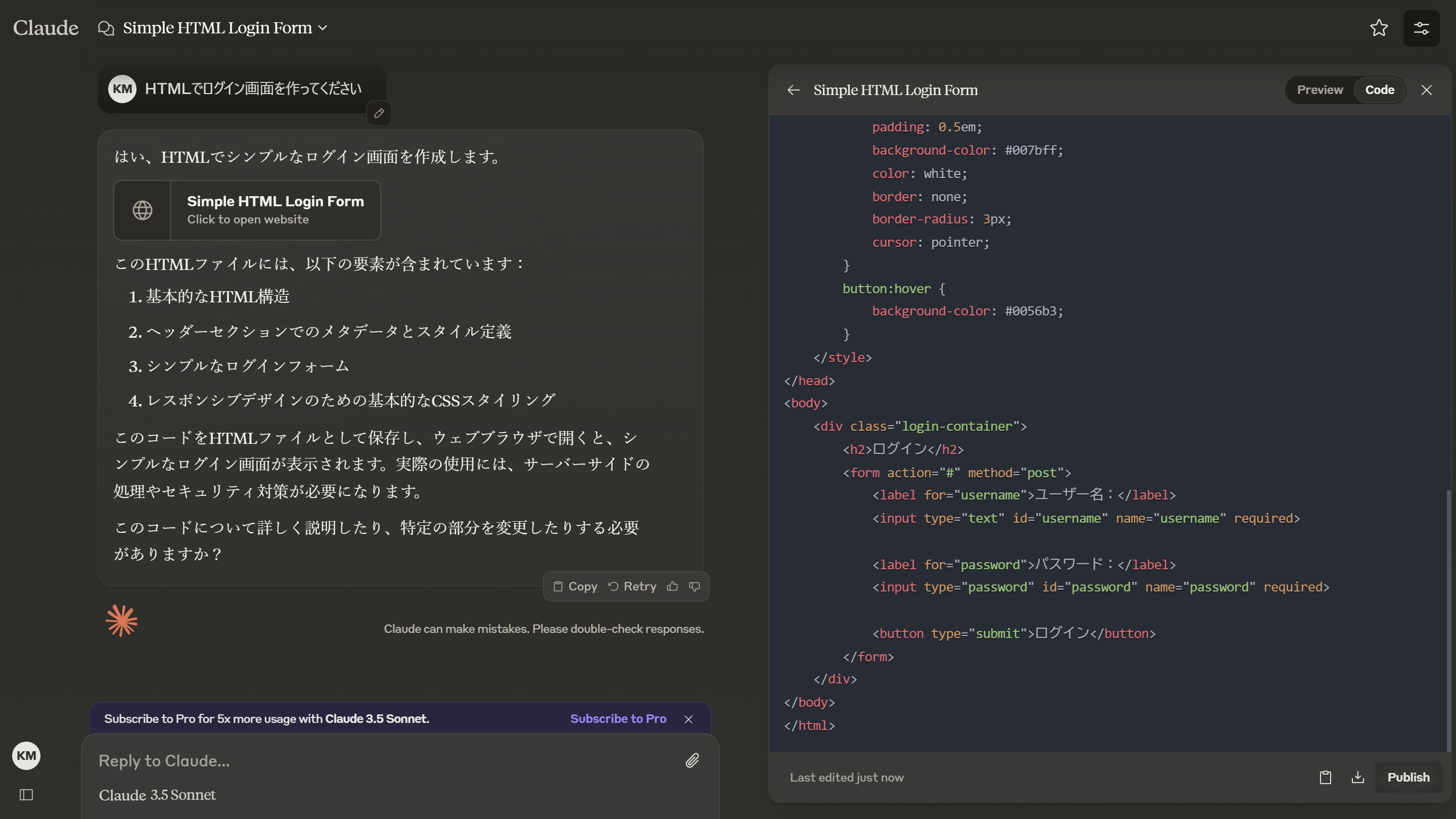 HTMLの生成をお願いすると、上手にHTMLを生成してくれます。