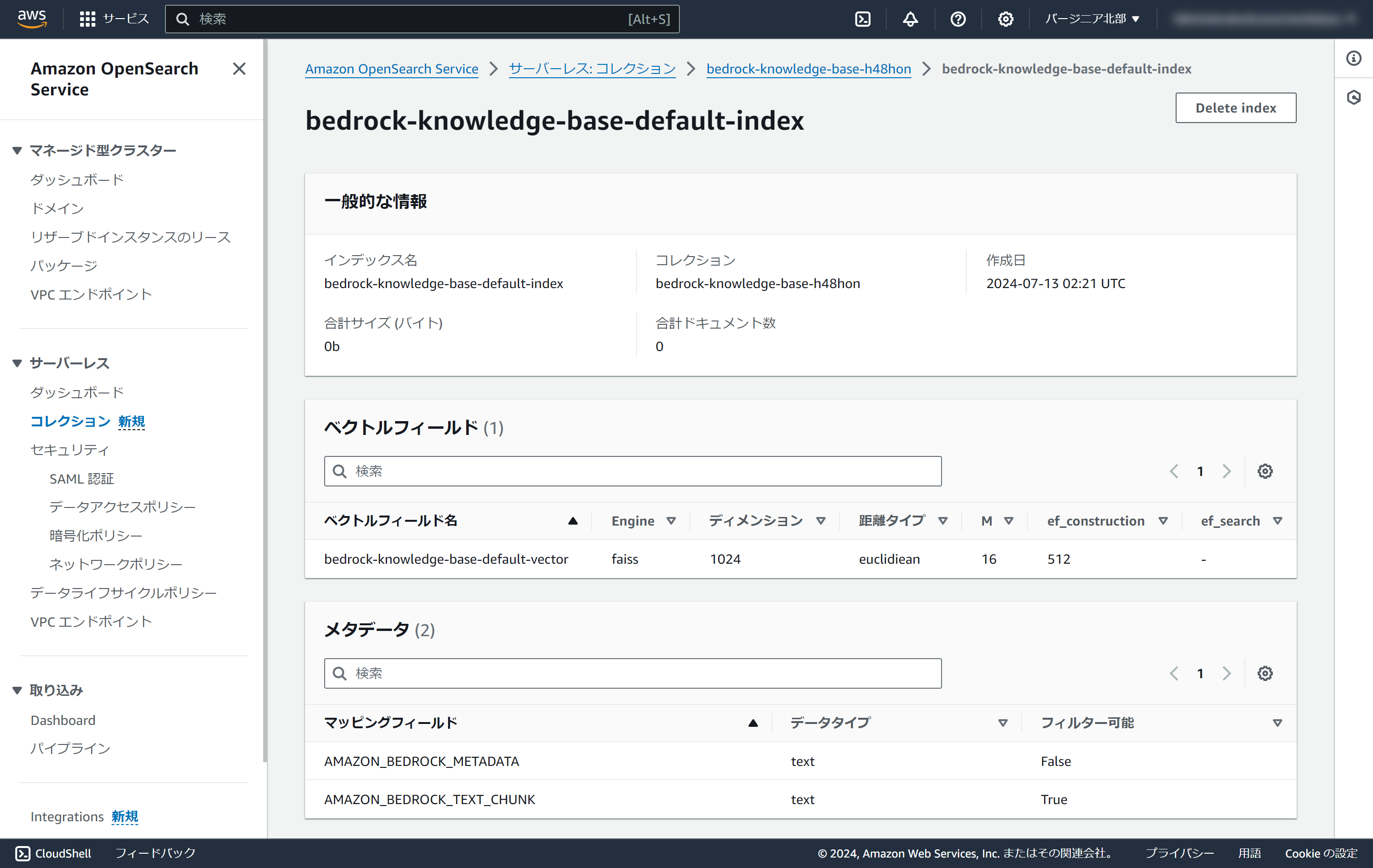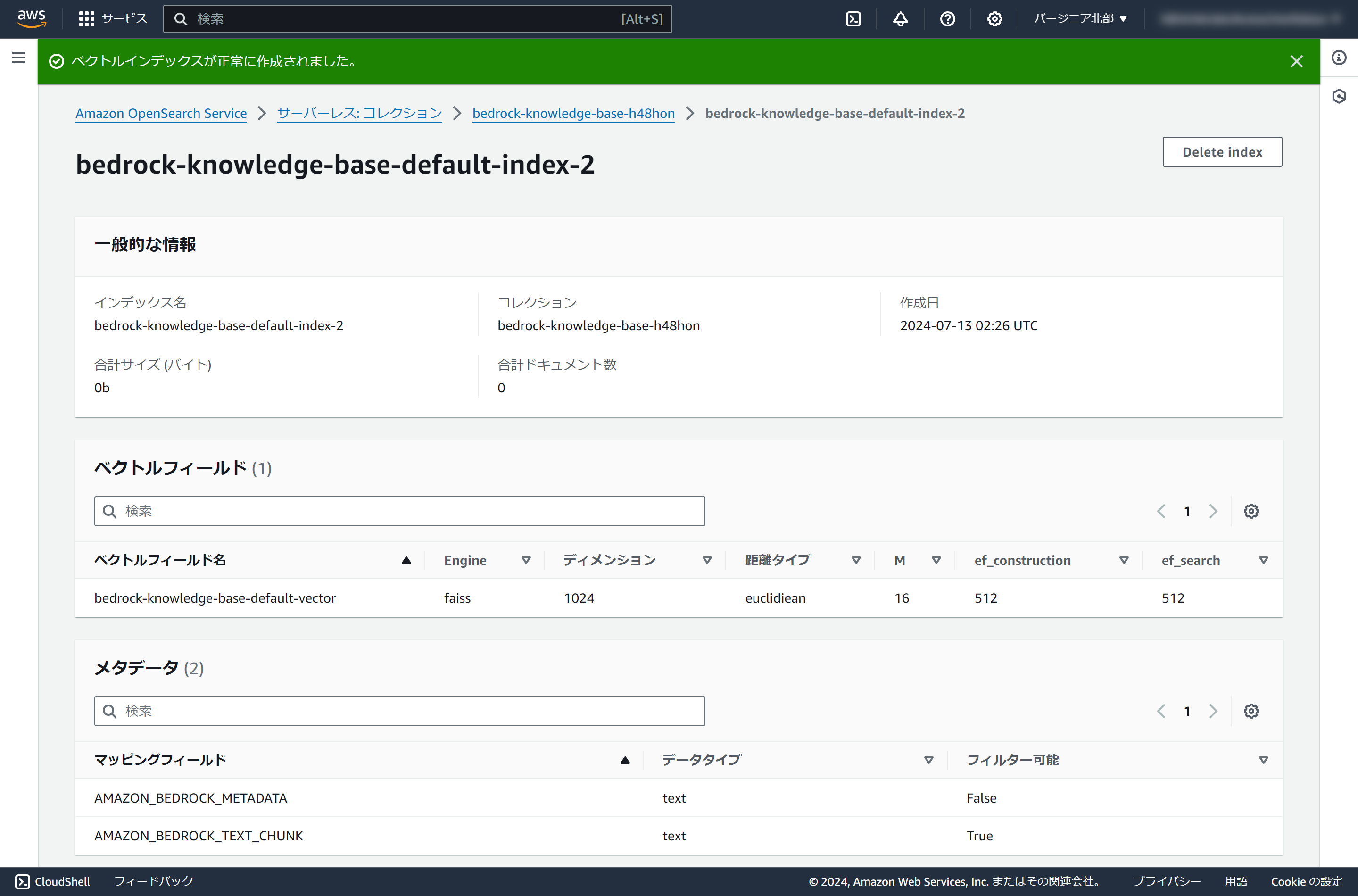ベクトルフィールドやメタデータを真似して、 「bedrock-knowledge-base-default-index-2」 を作成します。