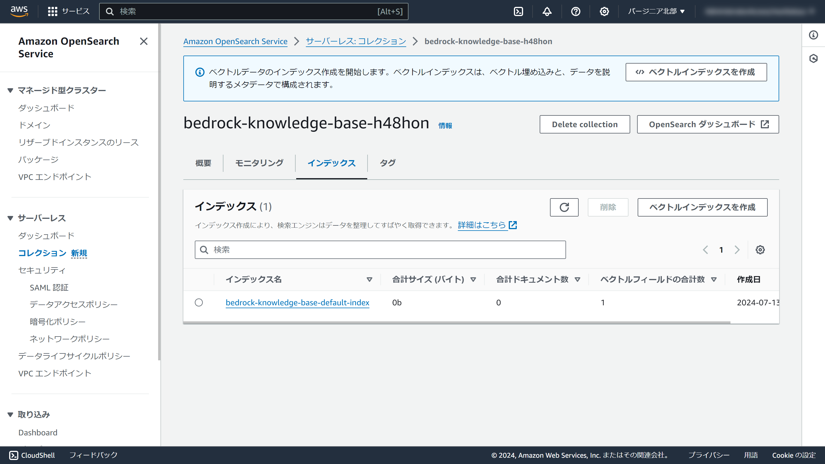 OpenSearch Serverlessには1つのコレクションと1つのインデックスがある状態です。