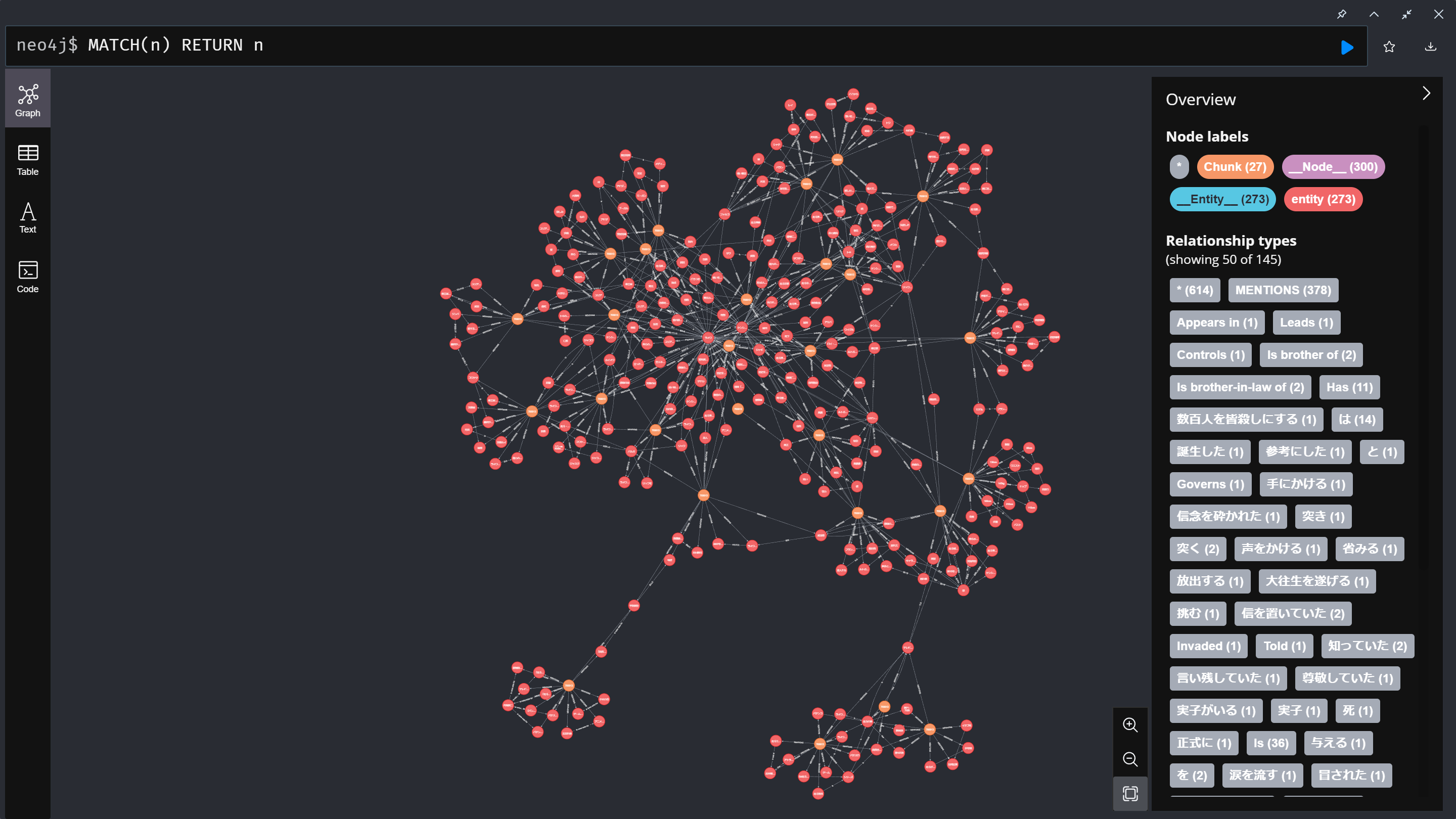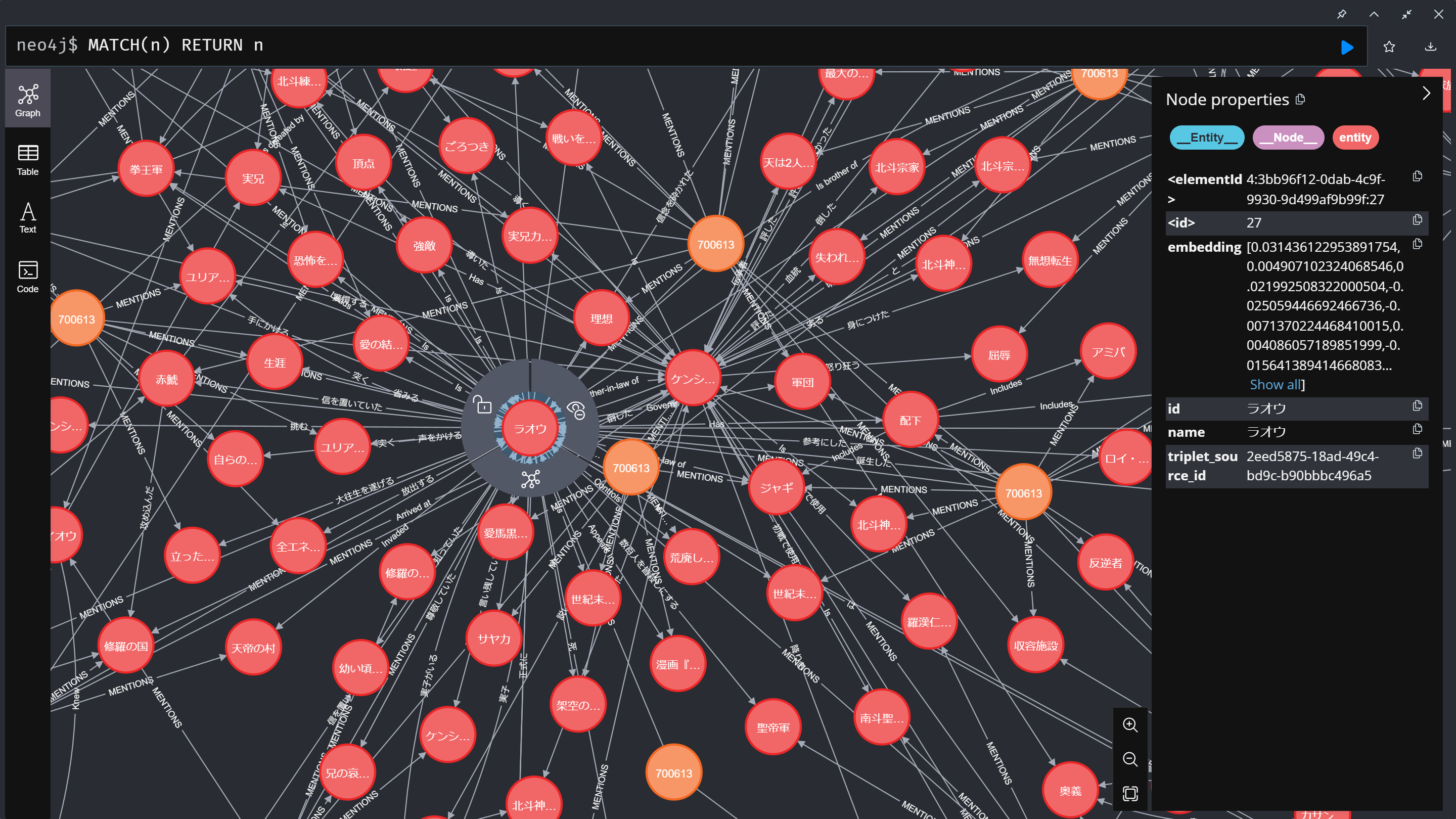 OpenAIで行った際は発生しなかったのですが、Claude 3 Haikuの場合には、ナレッジグラフの関係作成の結果が英語になることがありました。(ラオウがRaohに)