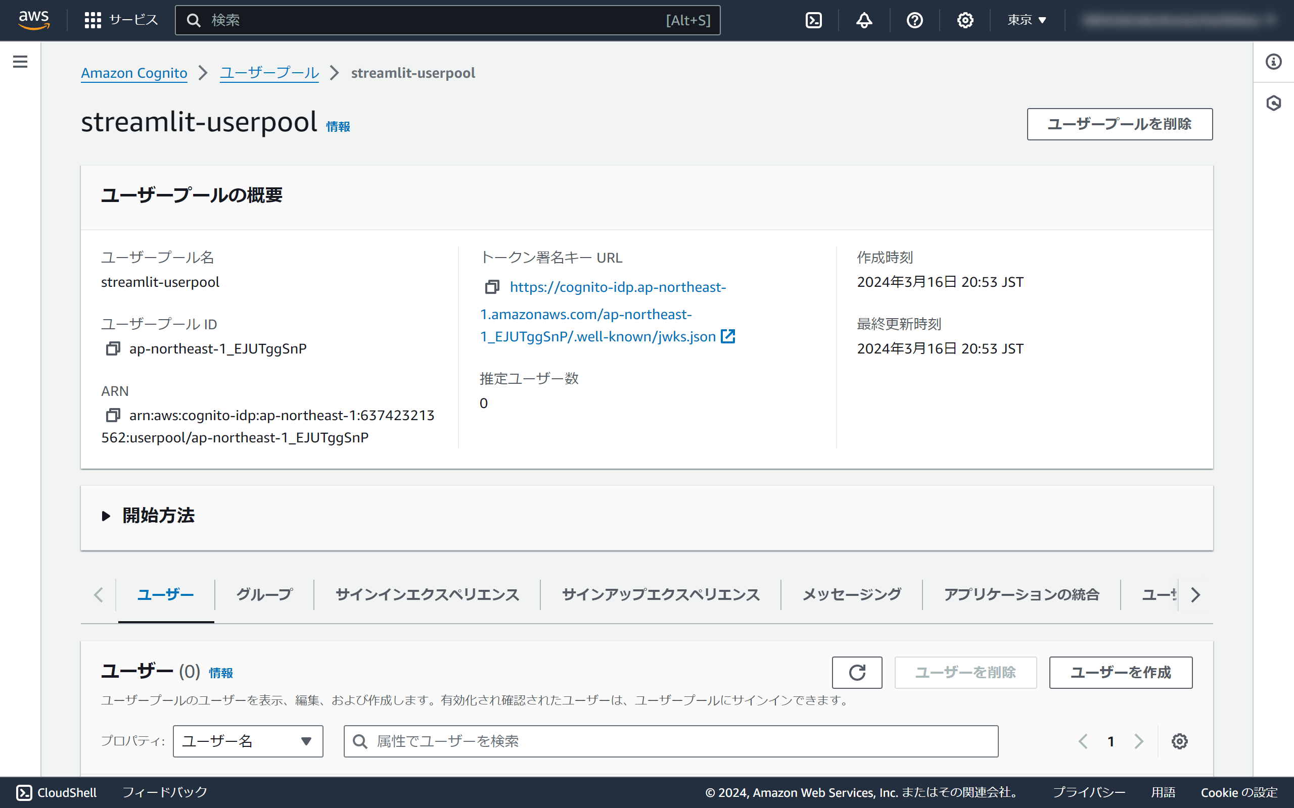 項目 リージョン ユーザープールID クライアントID クライアントシークレット ホストされた UIのドメインプレフィックス