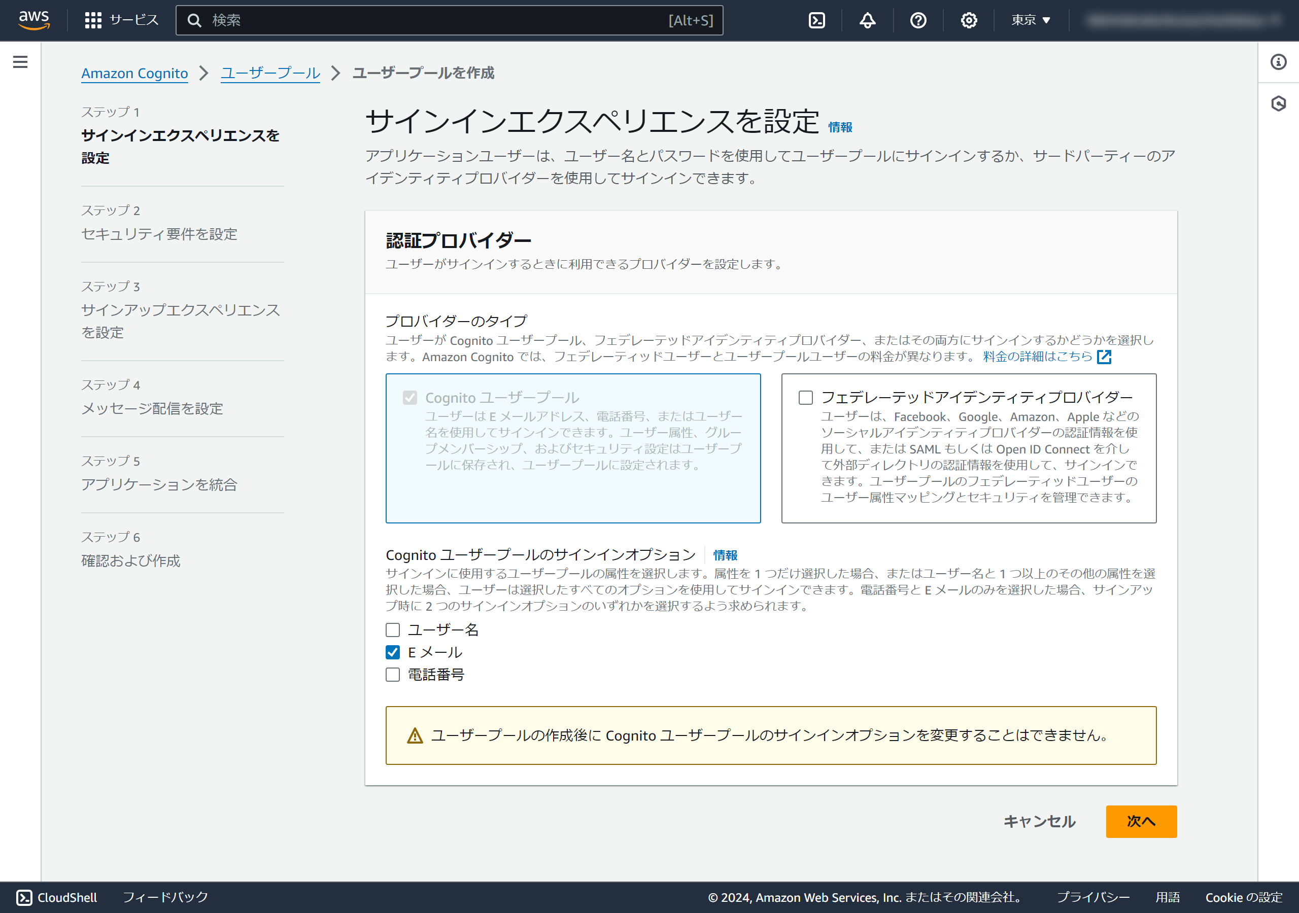 ユーザープールを作成ボタンをクリックサインインオプションを一つ選び