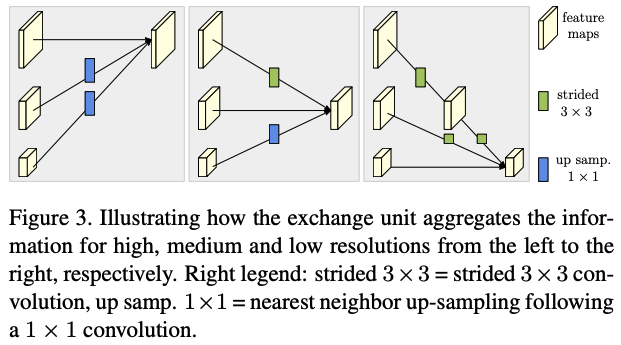 このような方法を取る事によるメリットは大きく2つあります.ひとつめは,それまでのモデルとは違って低解像度に畳み込むのと並列に高解像度のマップも維持しているため,低解像度マップからアップスケールするよりも空間情報が正確である.もうひとつは,パート3の特徴量を互いに交換するところで,それぞれの解像度における特徴マップにはない部分を互い補完し合うような形となり,よりリッチな特徴マップとなって,最終的なタスクの精度も上がる.