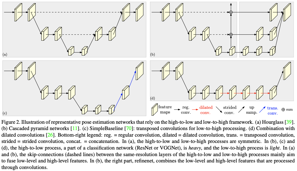HRNetの元祖はCVPR2019で発表された論文,「Deep High-Resolution Learning for Human Pose Estimation」[2]において示されました.それまでの多くの研究で紹介されたCNNモデルでは,下図の(a)~(d)に示されたように高解像度の画像を畳み込んで低解像度の特徴マップにした上で,それを再度up convolutionして高解像度化したり,それを元の高解像度マップと足し算していたりしました.