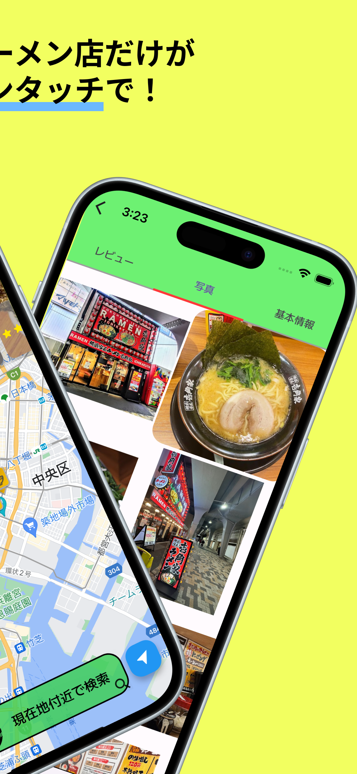 アプリの機能としては、現在地付近にて現在営業中のラーメン屋だけを検索して地図上に表示します。現在地からの距離た簡単なレビュー、写真を見る事ができます。