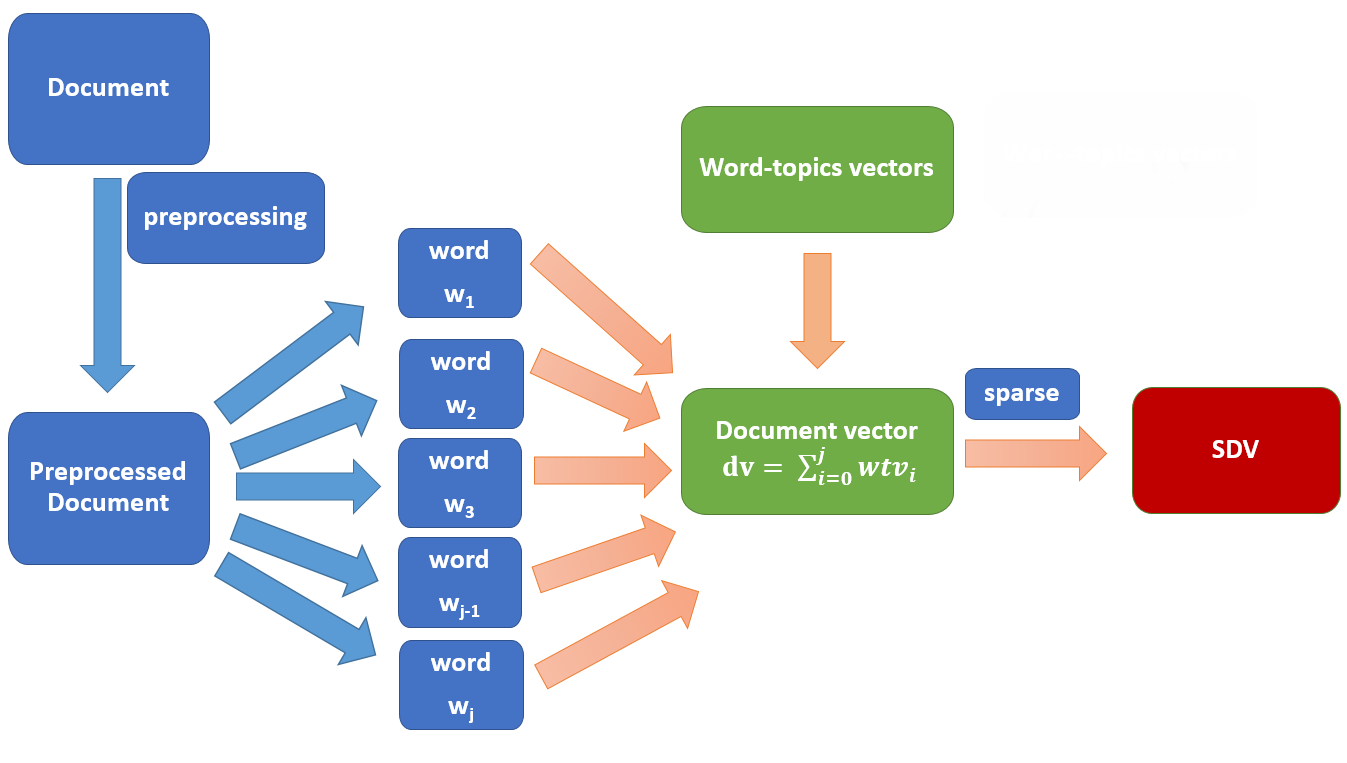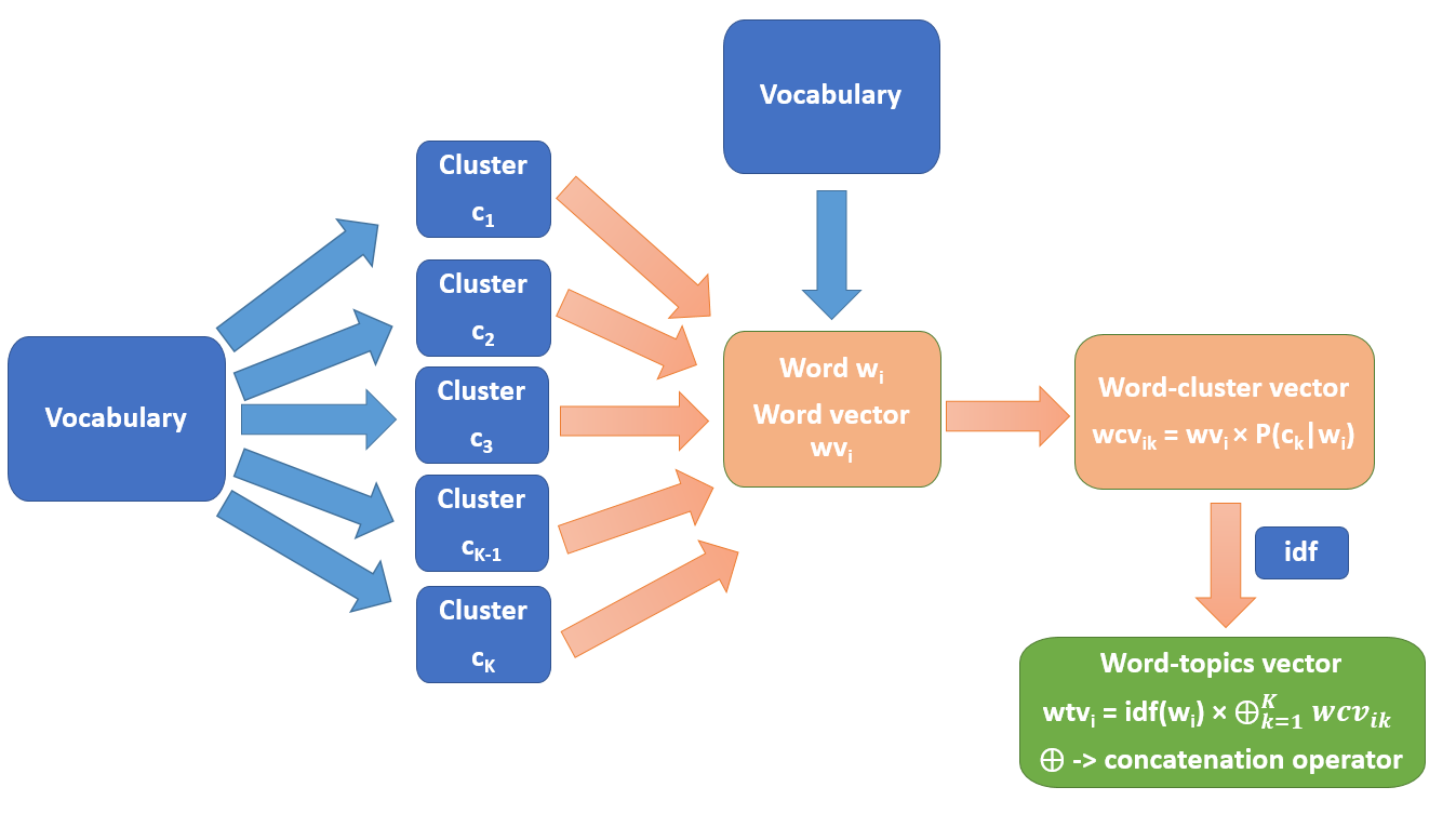 - Word-topics vectorは、単語の潜在的な複数のトピックを考慮する。具体的には、単語ベクトルへソフトクラスタリング(GMM)を適用し、各クラスタへの帰属度および文書のIDF値を考慮して、クラスタの数だけ単語ベクトルを連結する