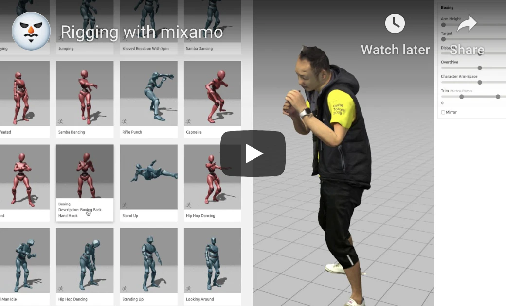 リギングしたモデルには、2,000以上あるアニメーションを割り当ててその場でプレビューできます。これで色々試しているだけでもだいぶ楽しいです。