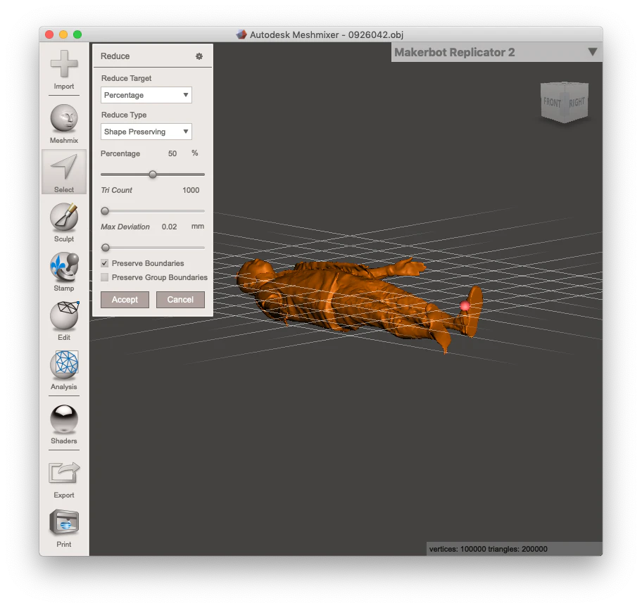 Selectから全部選択してEdit→Reduce、デフォルトで50%になっているのでそのままAccept、再びOBJでエクスポートします。