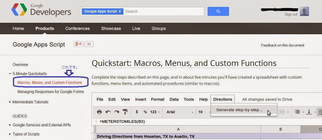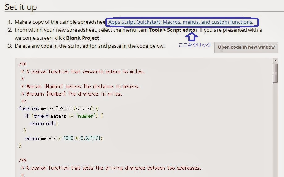 今回は、その中の「5-Minute Quickstarts」→「Macros, Menus, and Custom Functions」をコピーしてGASを作りましょう。