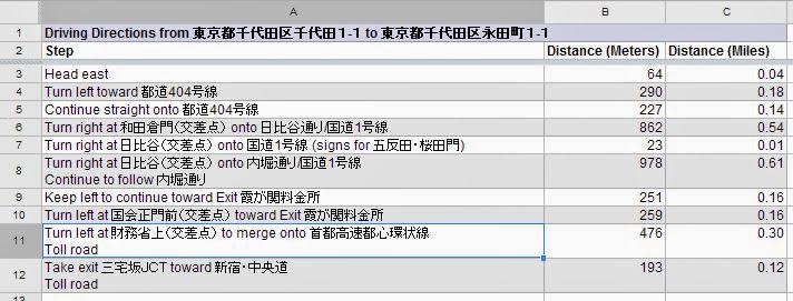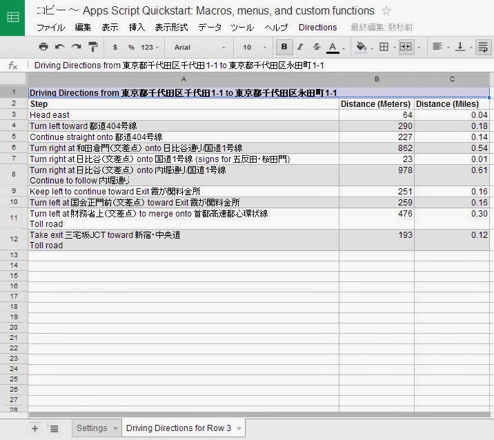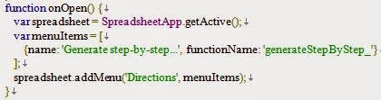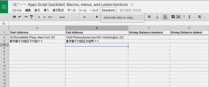 ちなみにこのコピーしたスクリプト、こんなことしてくれるんです。1.スプレッドシートを開いた時に、自動的にメニューバーに「Directions」→「Generates step-by-step」という独自メニューを追加