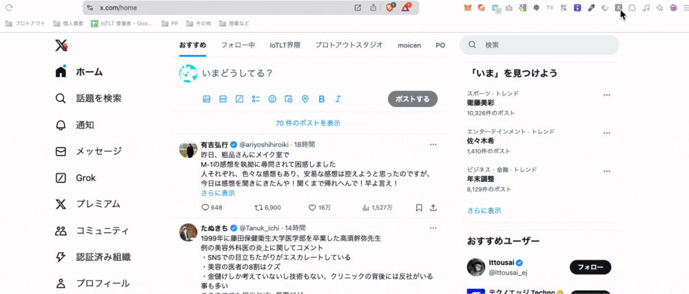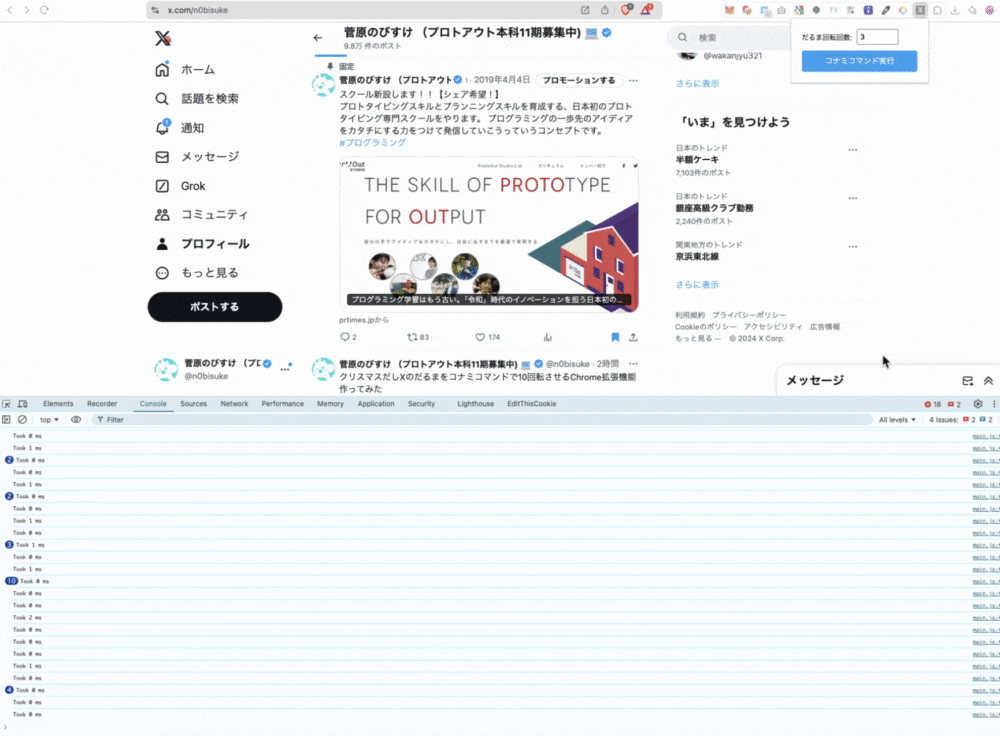 X(旧Twitter)で、コナミコマンド(上上下下左右左右BA)を入力すると、サイト上部のロゴが回転する機能が(この冬限定かな?)実装されています。これを自動的に実行できるChrome拡張機能を作ってみました。 12/25に知って12/25に作ってるのでかなり勢い ですね。