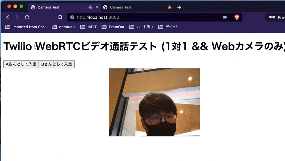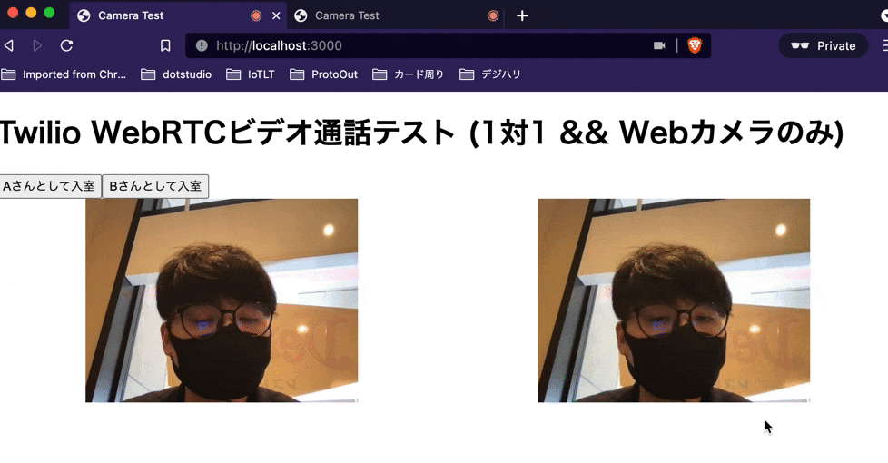 こんな感じでNode.jsなども利用せずにフロントだけでTwilioのWebRTC機能を試すことが出来ました。