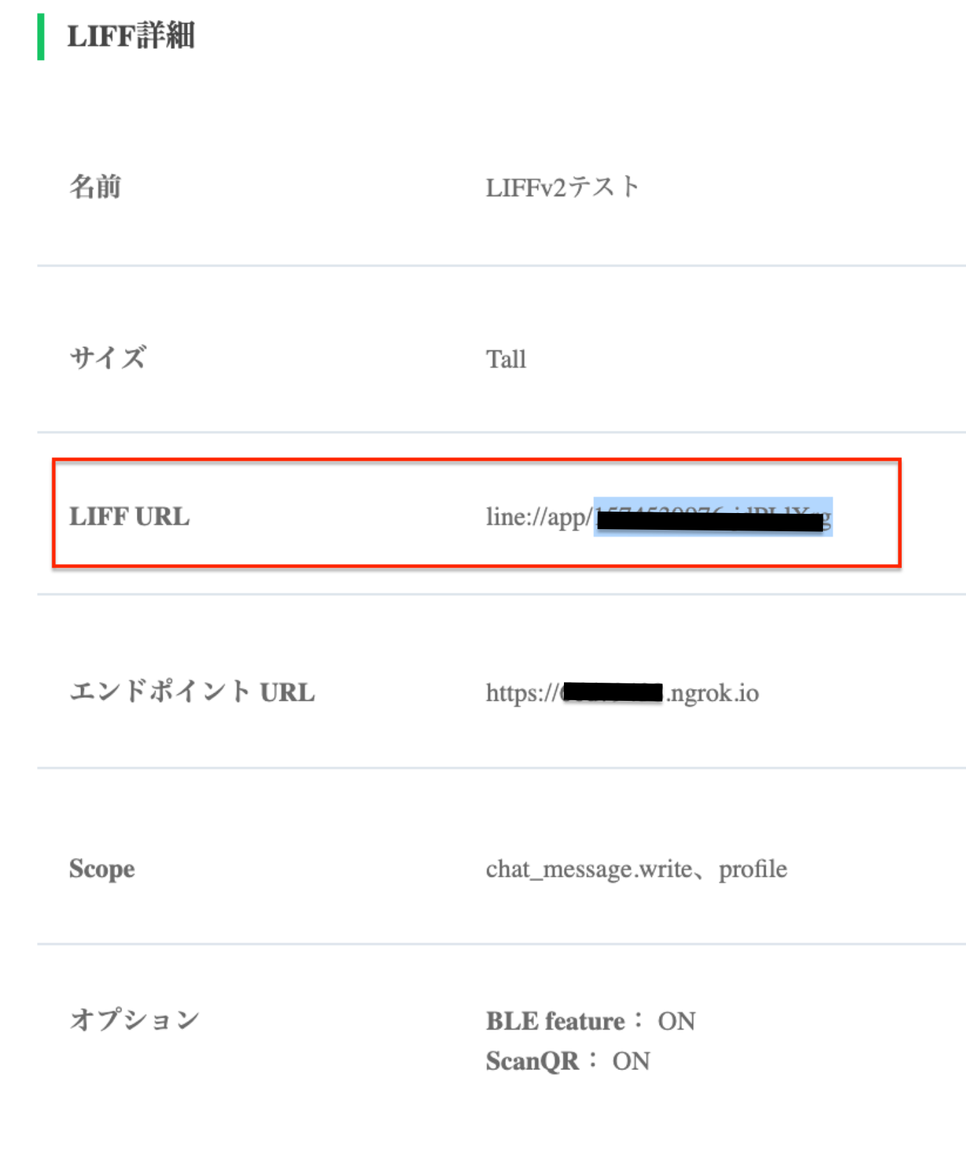 作成したLIFFアプリケーションを確認し、LIFF URLの line://app/xxxxxxxxのxxxxxxxxをメモしておきましょう。