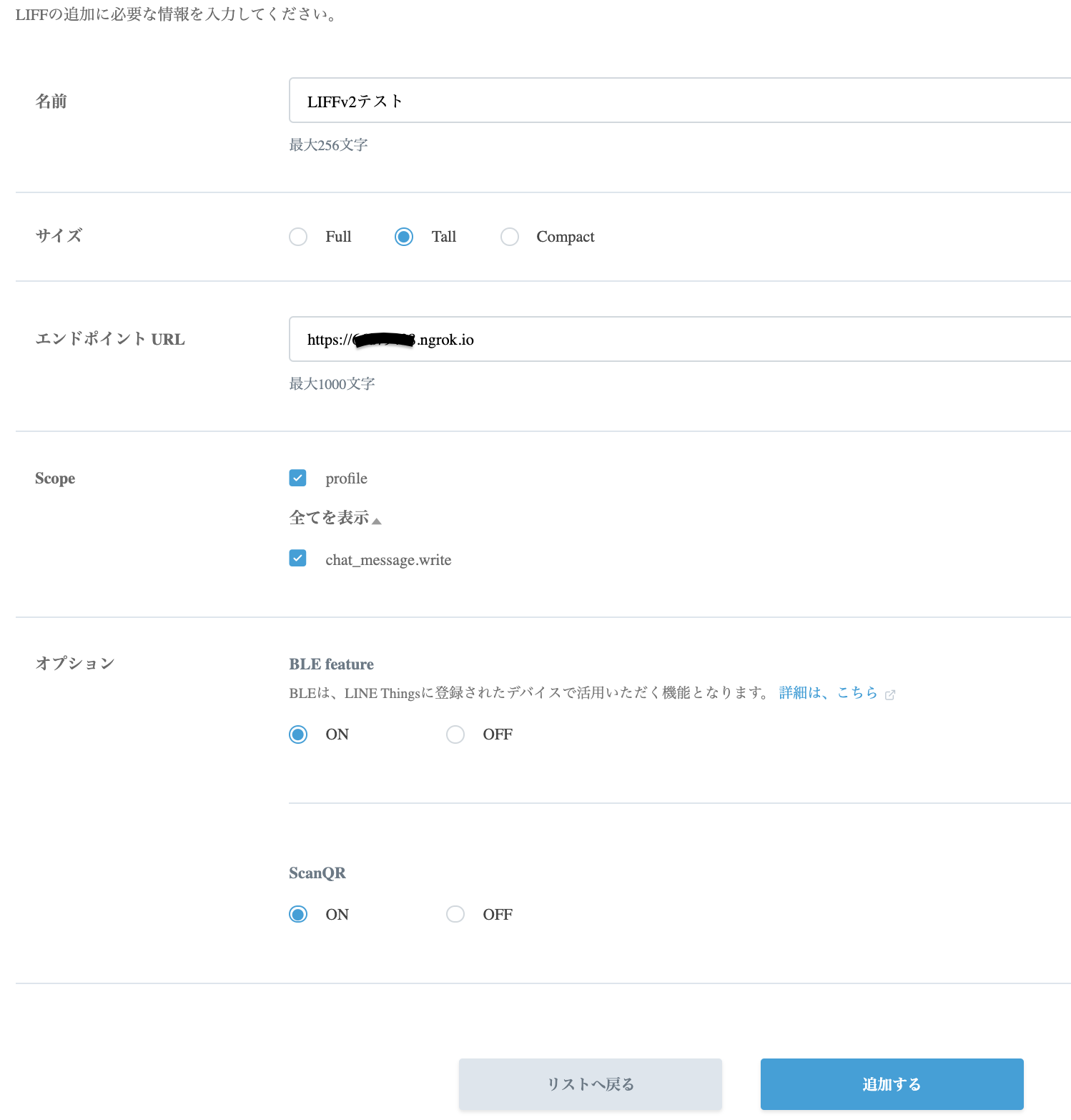 エンドポイントURLに 先ほどのngrokのアドレスを指定し、キャプチャのようにチェックをして追加するを押しましょう。