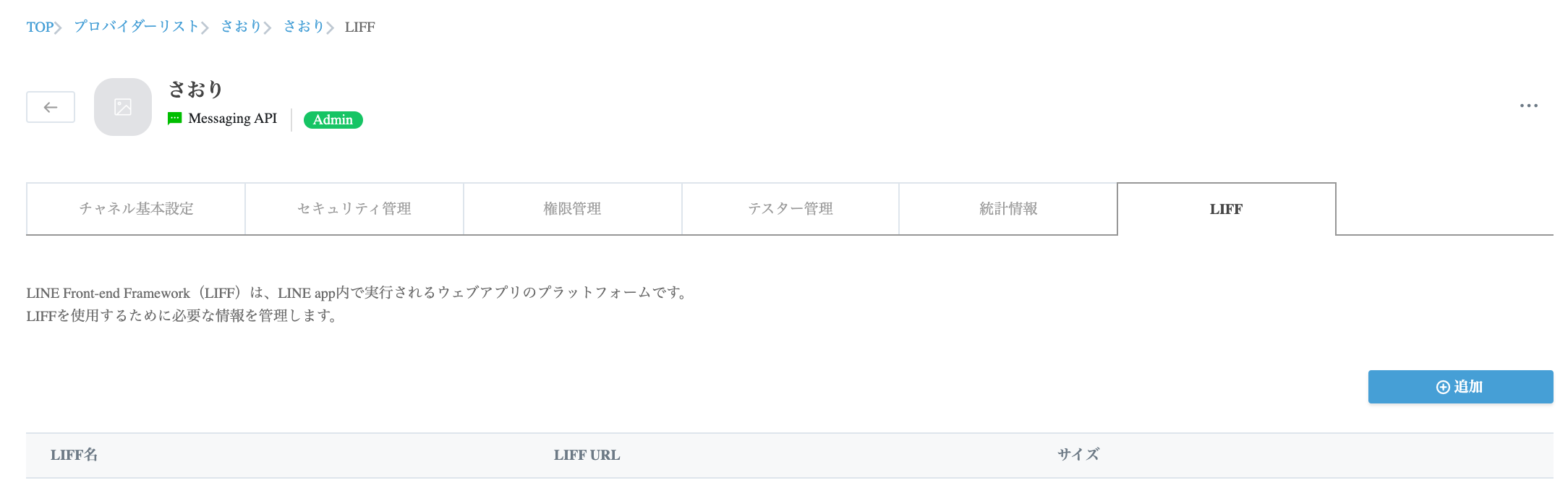 LINE DevelopersのLINE BOTの管理画面からLIFFのタブを選択し、追加ボタンを押しましょう。