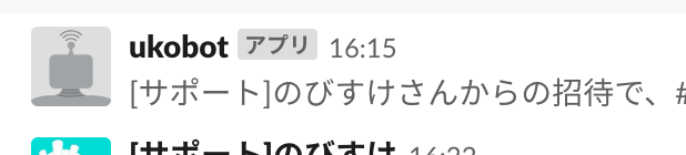 通常のSlackの操作でBOTをチャンネルに追加出来ます。