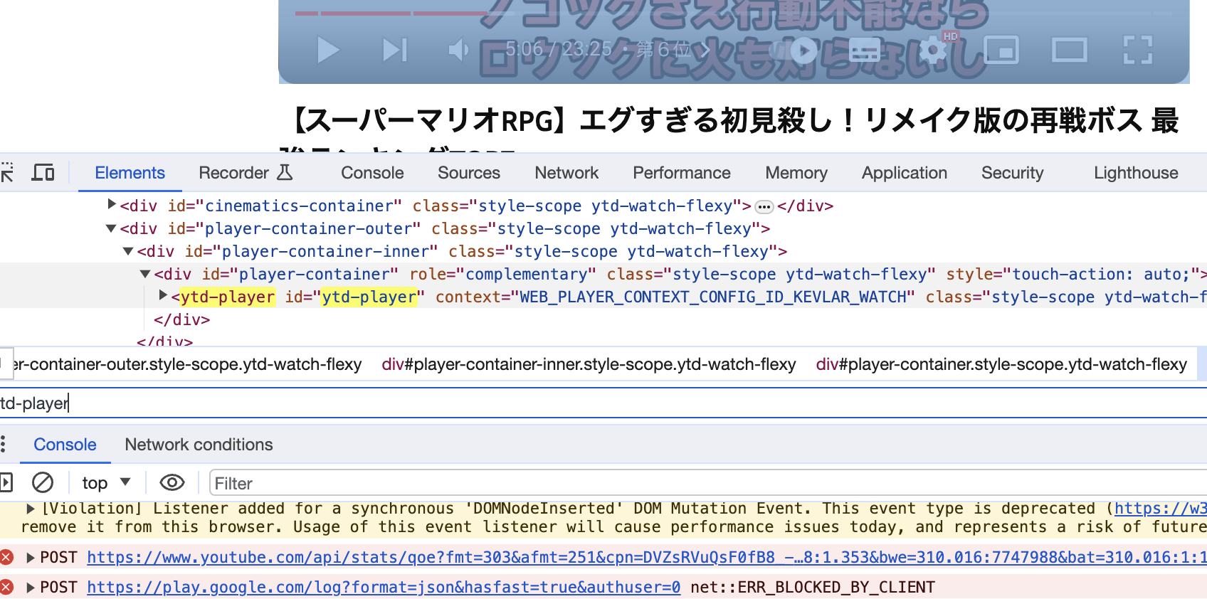 YouTubeのプレイヤーエリアにはytd-playerというidが振られている模様でした。