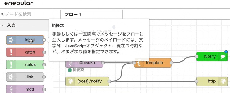 - injectノードを追加して試して通知を試してみます。線で↓のように結んだら右上のボタンで